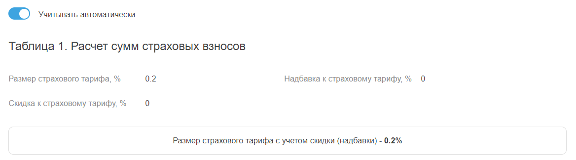"Размер страхового тарифа, %" - показатель в данное поле подтягивается из реквизитов организации/ИП;