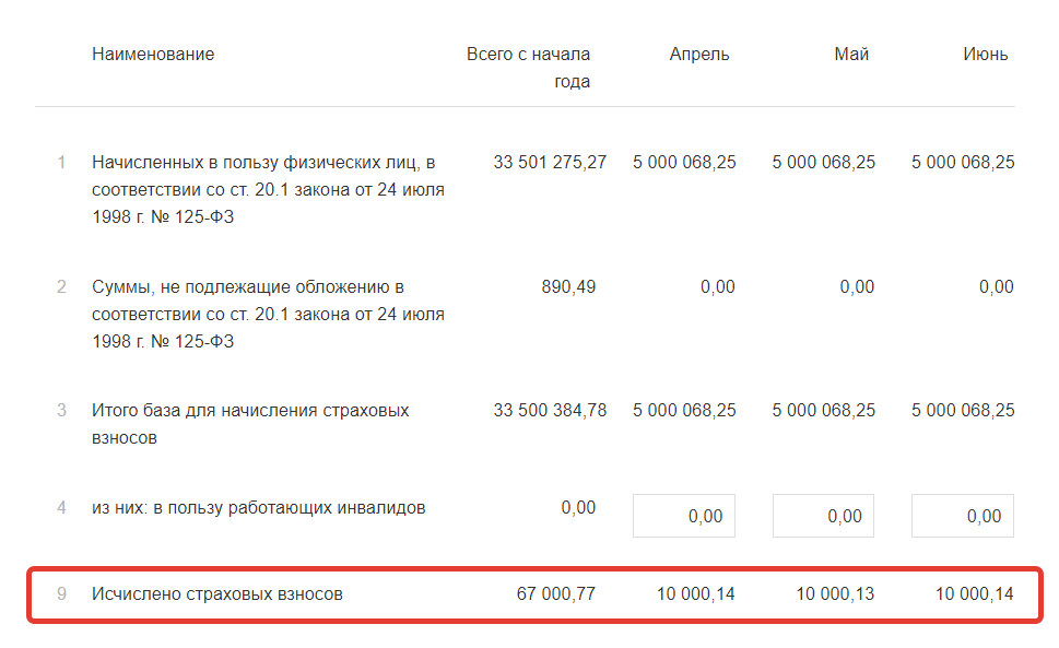 В строке 9 указывается сумма взносов в ФСС на травматизм, начисленная по всем сотрудникам за соответствующий отчетный период нарастающим итогом. Значения по данной страке указываются сервисом автоматически.