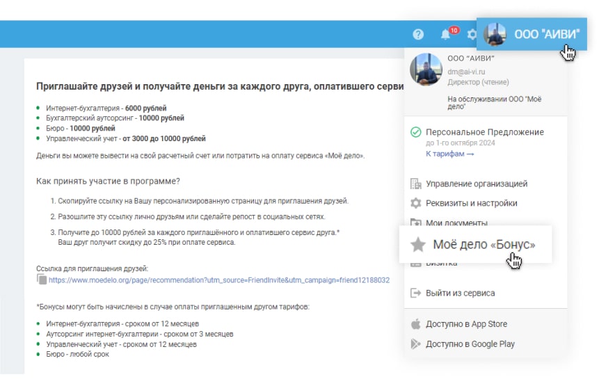 - В появившемся меню переходите в «Моё дело «Бонус»
