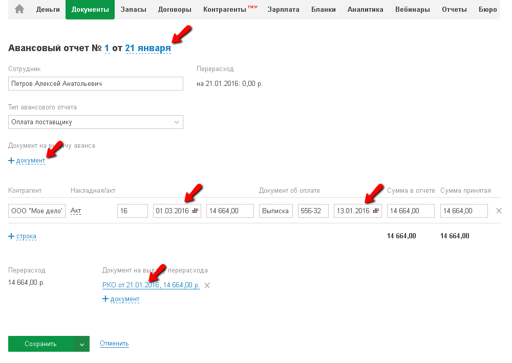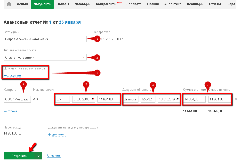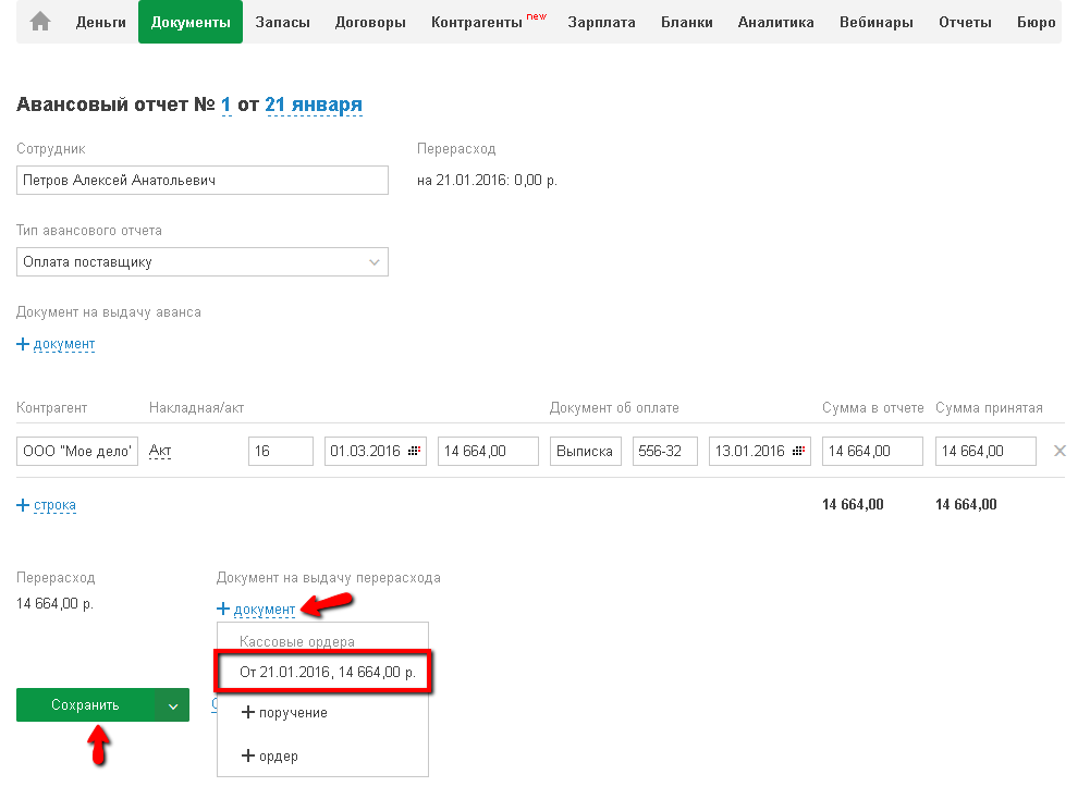 В. Вернитесь в созданный ранее Авансовый отчет и в поле "Документ на выдачу перерасхода" выберите платежное поручение или РКО по операции из Денег. Сохраните.