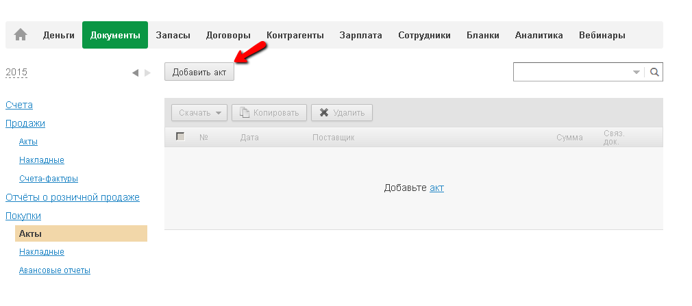 1. Начать необходимо с акт приема передачи права использования программного обеспечения (сервиса). Как его скачать показано здесь. Реквизиты скаченного акта необходимо отразить в разделе Документы. Для этого нужно нажать Акты - Добавить акт.