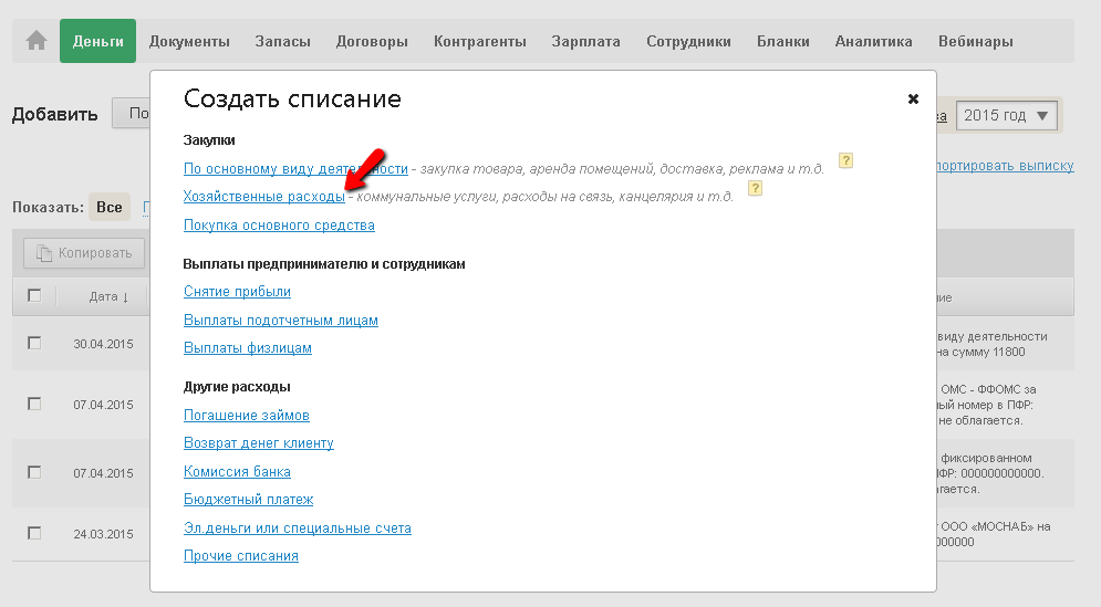 2. Затем в разделе Деньги нужно создать операцию Списание - Хозяйственные расходы также, как это было показано выше, при выключенных запасах.