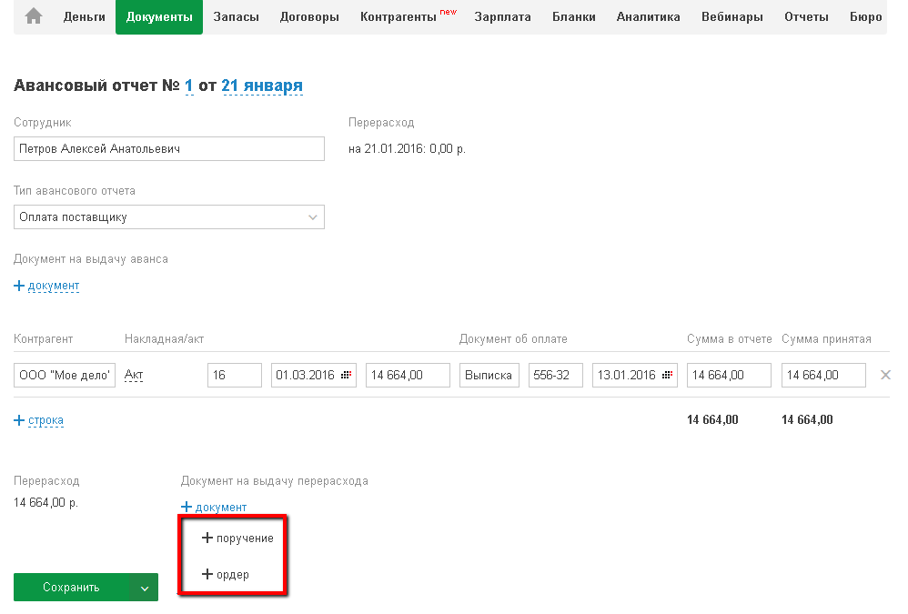 Б. Далее нужно отразить возврат денег подотчетному лицу. Если по факту он уже состоялся, то удобней это сделать здесь же в авансовом отчете. Для этого в строке "документ на выдачу перерасхода" нажмите "+документ" и выберете "поручение", если затраты возмещались работнику безналом, или "ордер", если затраты возмещались работнику наличными. Подробнее об оформлении авансовых отчетов и расчетах с сотрудниками см. справочную информацию.