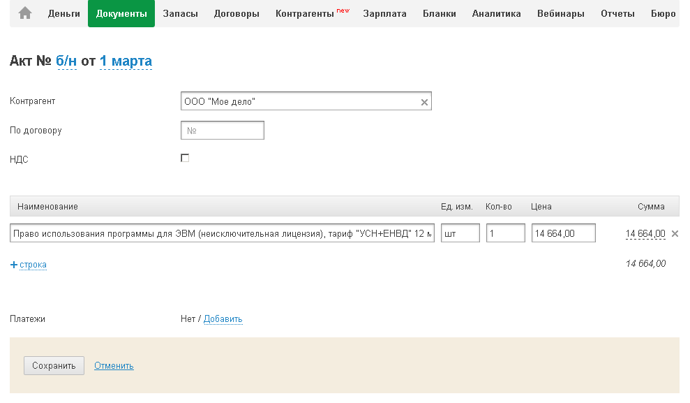 5. Накладная/акт - выберете "акт" и укажите реквизиты из акта приема-передачи права использования сервиса "Мое дело" (программы для ЭВМ).