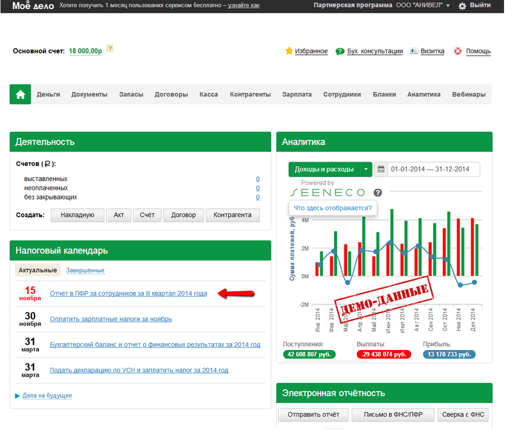 Действие по подготовке отчета в ПФР по сотрудникам за квартал отражается в "Налоговом календаре" на Главной странице.
