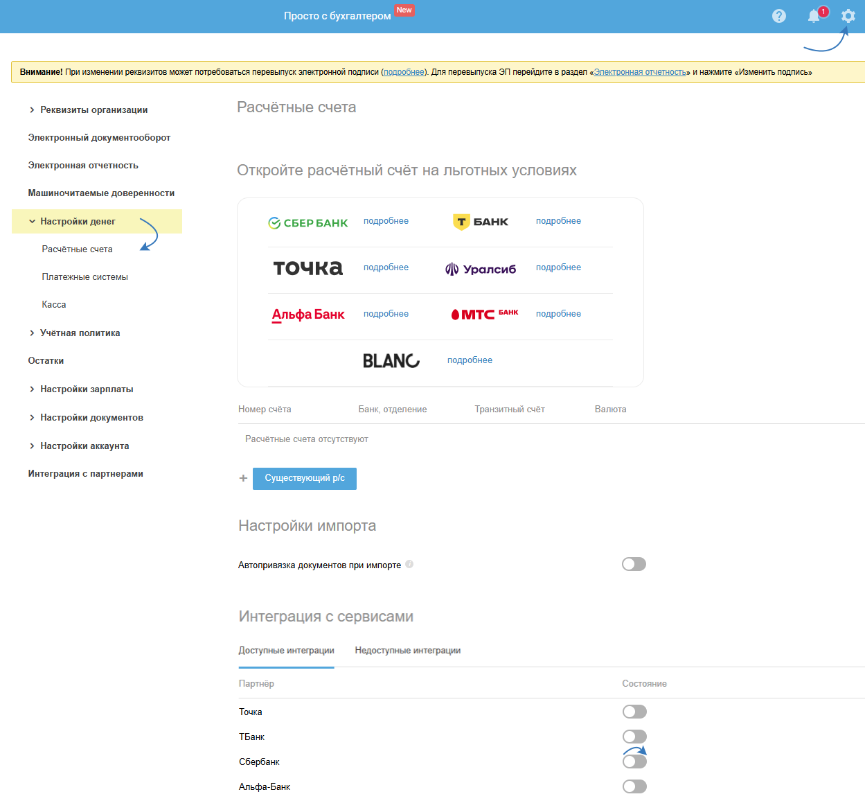 Интеграцию с банком можно подключить из раздела «Реквизиты» и раздела «Деньги»: