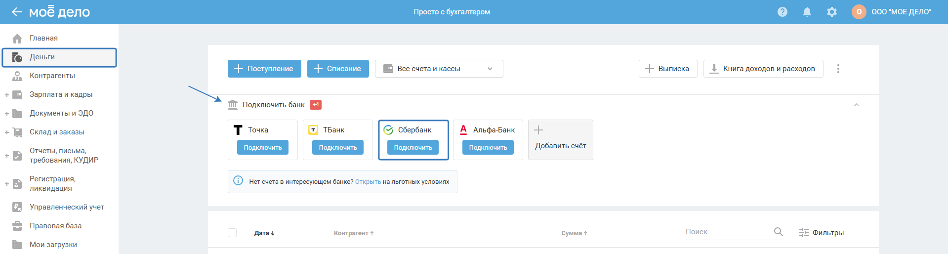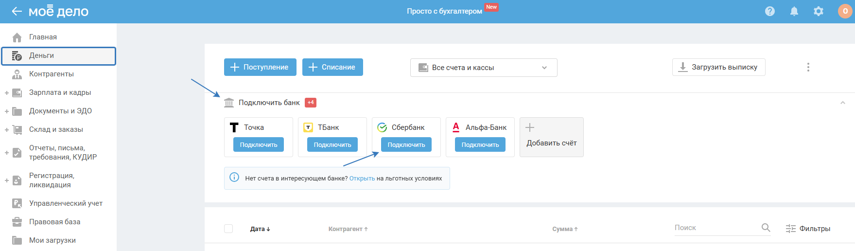 После успешного подключения интеграции вы будете возвращены в раздел «Деньги». Все имеющиеся в банке расчётные счета подтянутся в сервис автоматически.