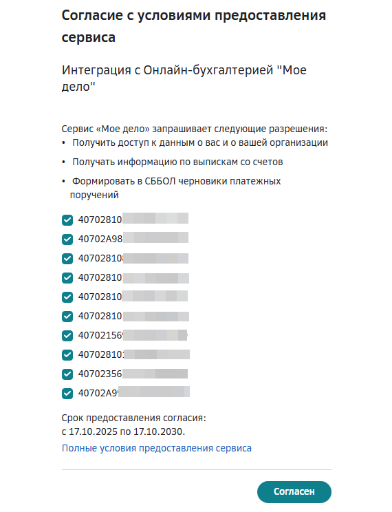 5. Подтвердите согласие с условиями предоставления сервиса ООО «Моё дело» (сервис сможет запрашивать выписки и формировать платёжные поручения), нажав на кнопку «Согласен»: