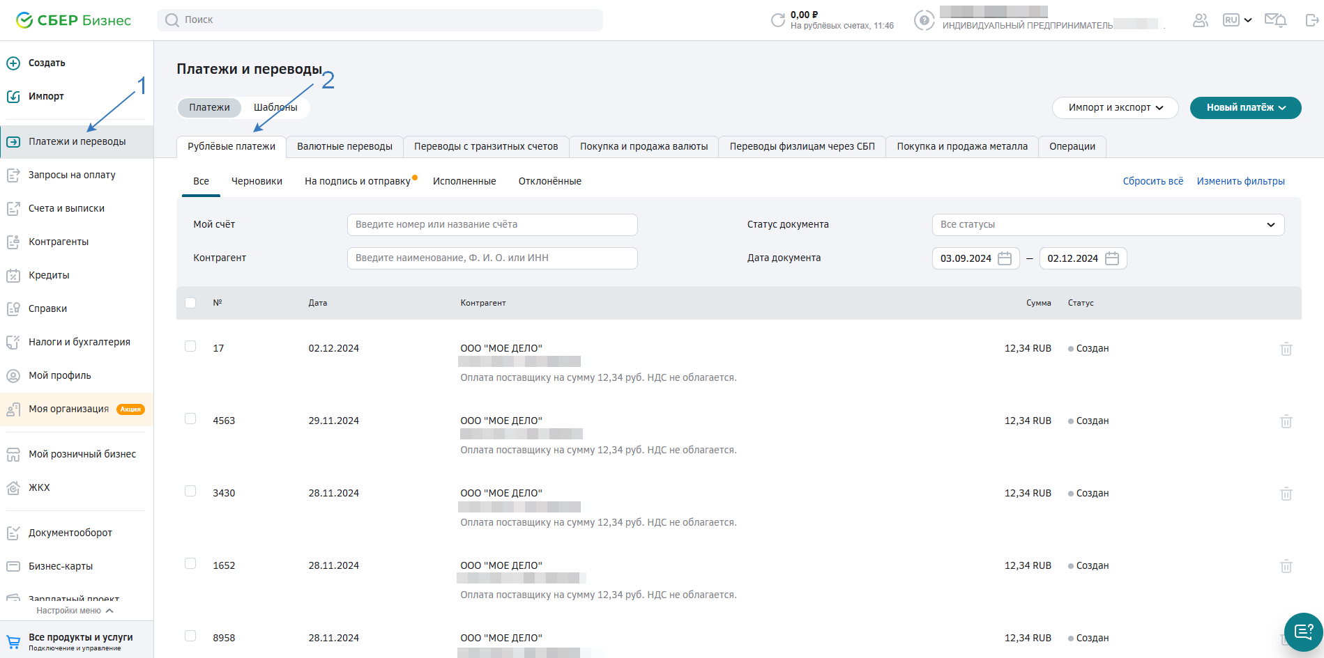 Отправленный из сервиса «Моё дело» платёж находится в разделе «Платежи и переводы» на вкладке «Рублёвые платежи» — «Все»: