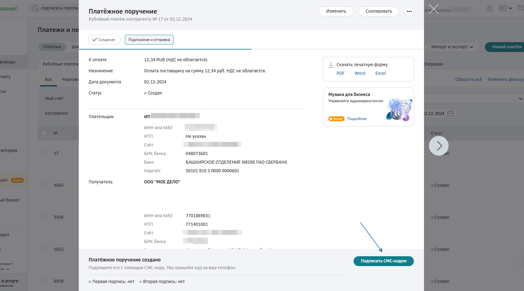 Откройте для просмотра платёжное поручение и для отправки его на исполнение нажмите кнопку «Подписать смс-кодом»: