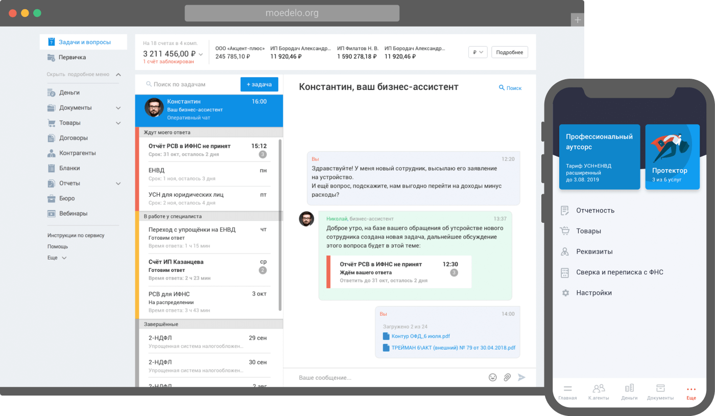 Загружайте в сервис фотографии необходимых документов — дальше дело за нами. Чтобы контролировать ведение учёта, не нужно специальных знаний. Мы сделали простой и понятный сервис для клиентов. Общайтесь с командой в любом удобном мессенджере, история переписки сохраняется в сервисе, поэтому ни одна деталь не потеряется.