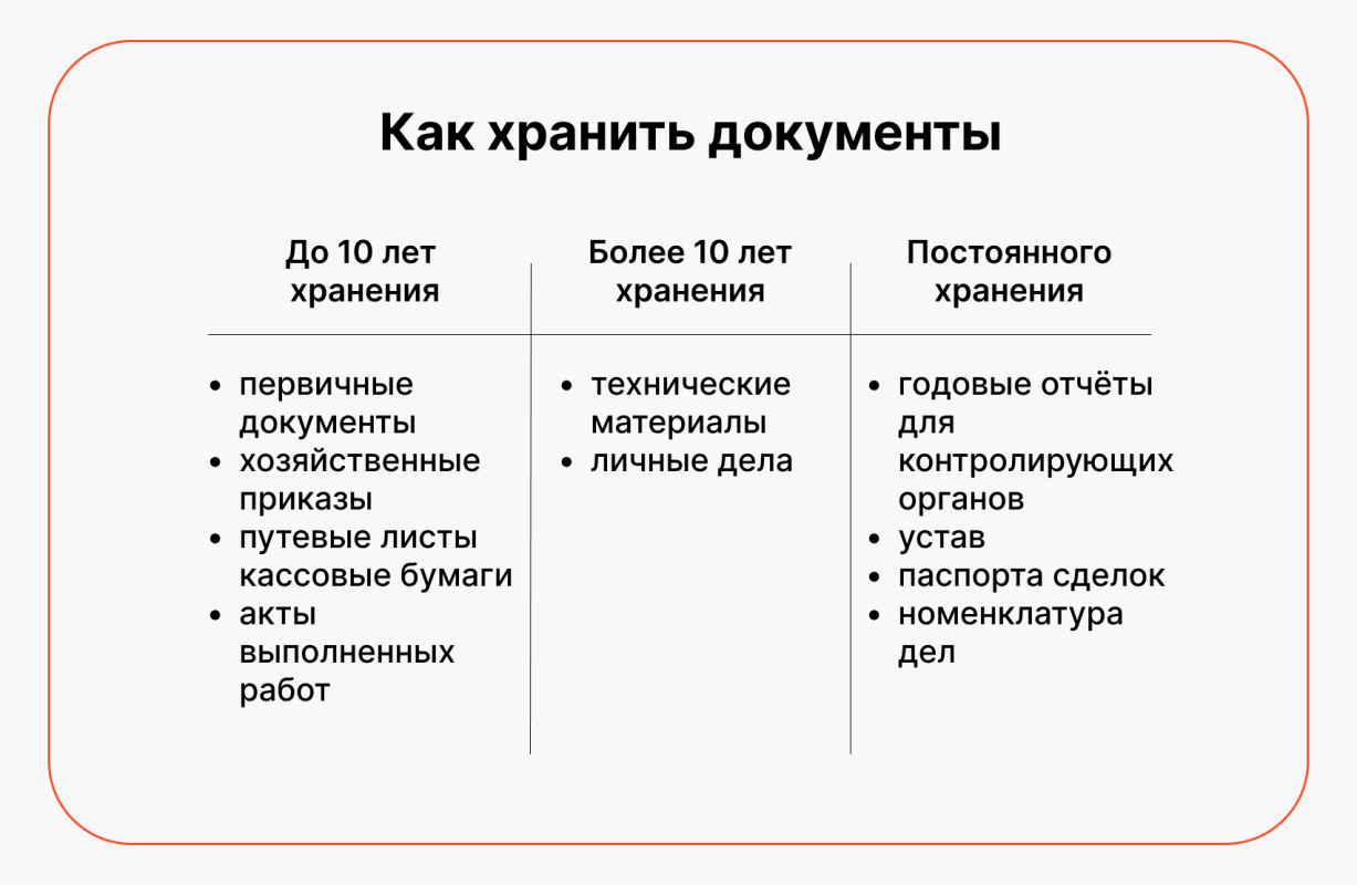 Если срок хранения документа 10 лет, они остаются в у вас — например, в отделе бухгалтерии. После окончания срока они уничтожаются. А если хранить документы нужно больше этого срока, сдайте их в специальный архив — это нужно сделать через год. Максимум — через 3 года после завершения обработки документов.