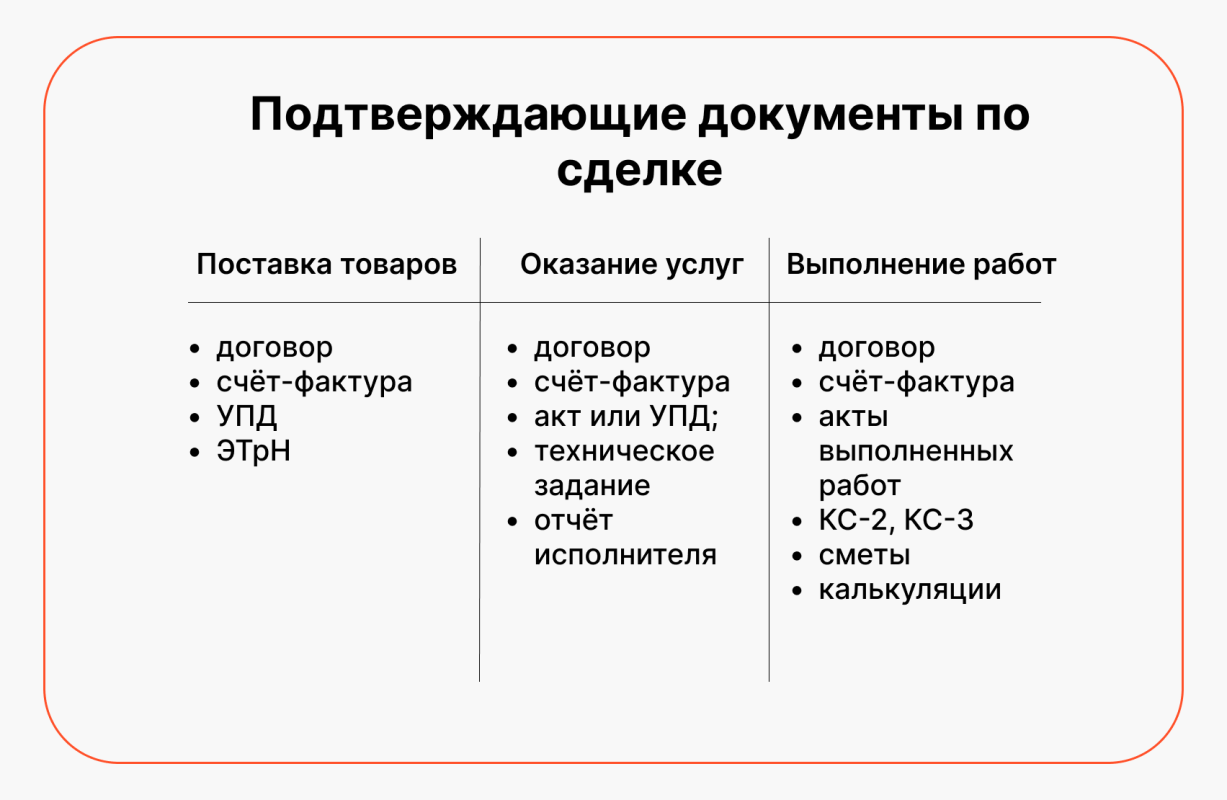 - Для подтверждения сделки нужен не только договор: потребуются счета, акты, накладные, УПД, счета-фактуры, платёжки, переписка, внутренние документы. Ещё нужно проявлять осмотрительность при выборе контрагента и хранить подтверждение его проверки.