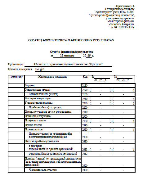 Аналогично заполняется отчёт о финансовых результатах — данные об организации ставятся те же самые, табличная часть оставляется пустой. Данные по предыдущему году переносятся из прошлого отчёта (при наличии).
