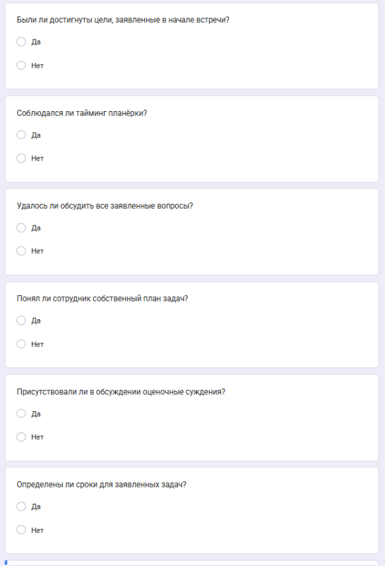 Запрашивайте обратную связь в такой же сокращённой и лаконичной форме, чтобы не отнимать время. Достаточно разослать короткие анкеты с основными вопросами. Например, такую: