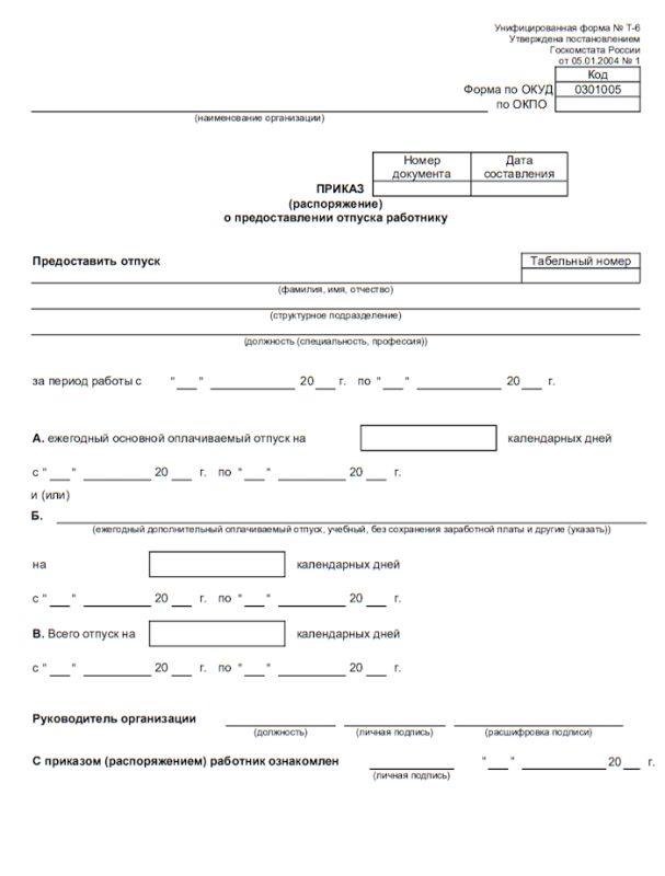 Форма №Т-6 для предоставления отпусков