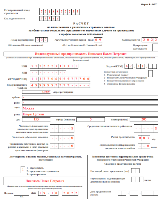Рассмотрим оформление расчёта 4-ФСС на примере: у ИП Николаев П.П. в штате всего 8 работников. Рабочих мест — 8. Спецоценка труда (СОУТ) по ним проведена в полном объёме. За 9 месяцев 2022 года пособия по профессиональным заболеваниям не платились, несчастных случаев не было. Все работают по 2 классу условий труда (допустимый уровень вредных или опасных факторов на рабочем месте, установленный по итогам их специальной оценки). Тариф страхового взноса по травматизму — 0,2%.