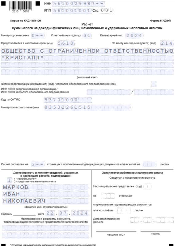 Заполнение 6-НДФЛ начинается с титульника. Он содержит данные о налоговом агенте — юрлице или ИП-работодателе. Нужно написать его полное наименование, ИНН, КПП, код учёта по месту нахождения, ОКТМО, контактный телефон. Также указывается двузначный код периода сдачи: