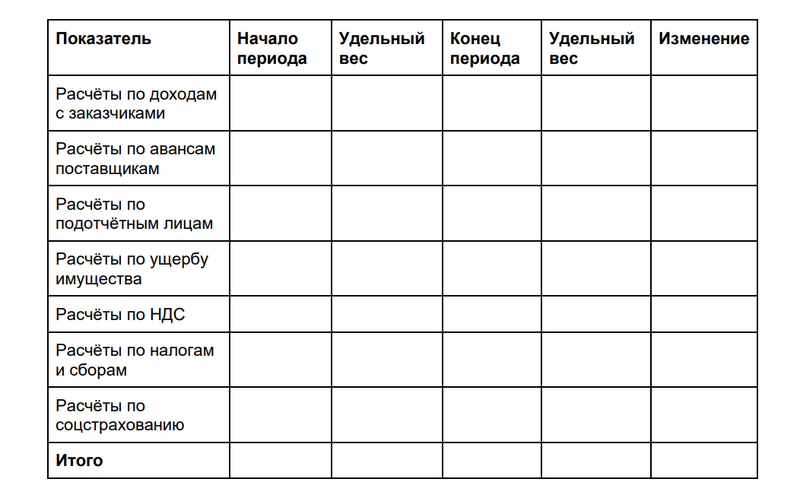 1. Изучить размер долгов дебиторов, основные пункты и динамику. Полученные расчёты удобнее оформить в виде таблицы, чтобы наглядно определить изменения.