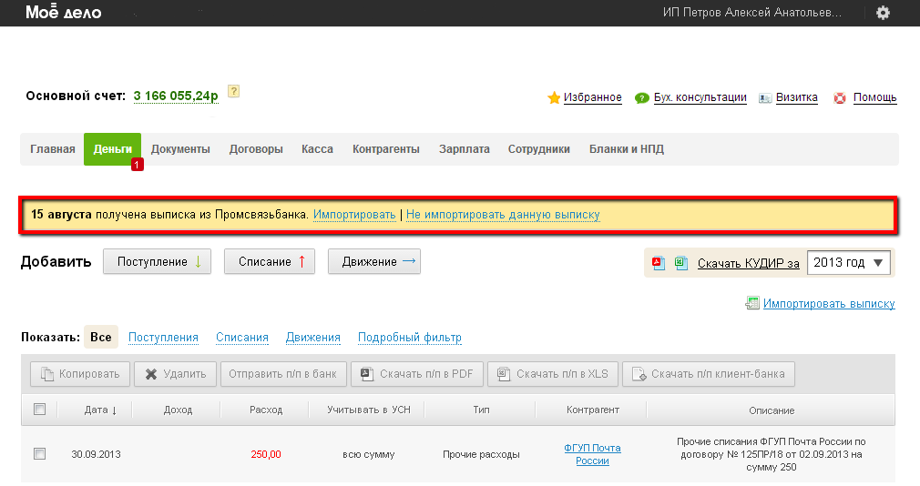 Затем, каждый раз при формировании банковской выписки за прошедший день (в Альфа-банке, Промсвязьбанке, СДМ банке и Локо-банке и т.д.), она будет автоматически отражаться в разделе «Деньги» на следующий день.