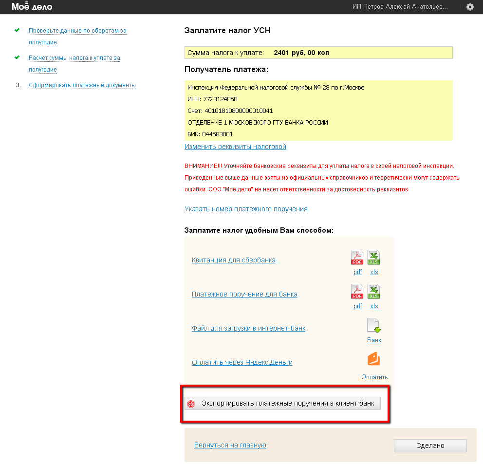 При включенной интеграции (кроме Локо-банка) можно напрямую отправить в интернет-банк платежное поручение на уплату налогов (взносов).
