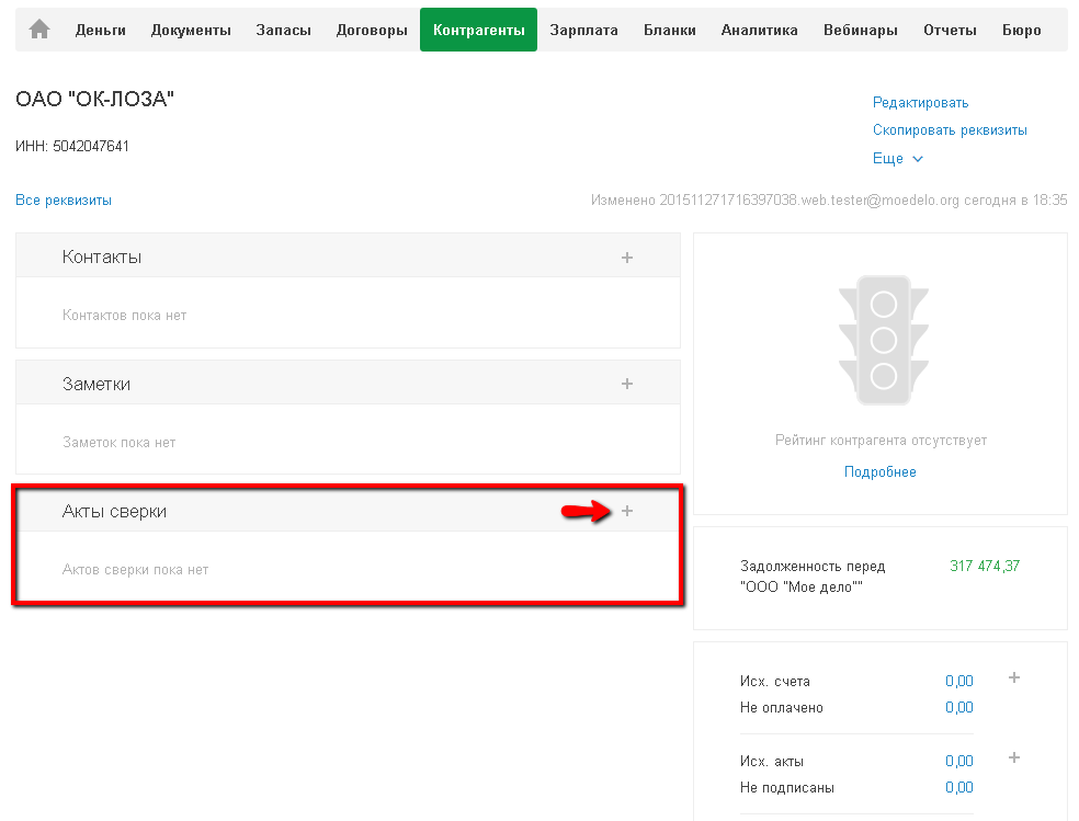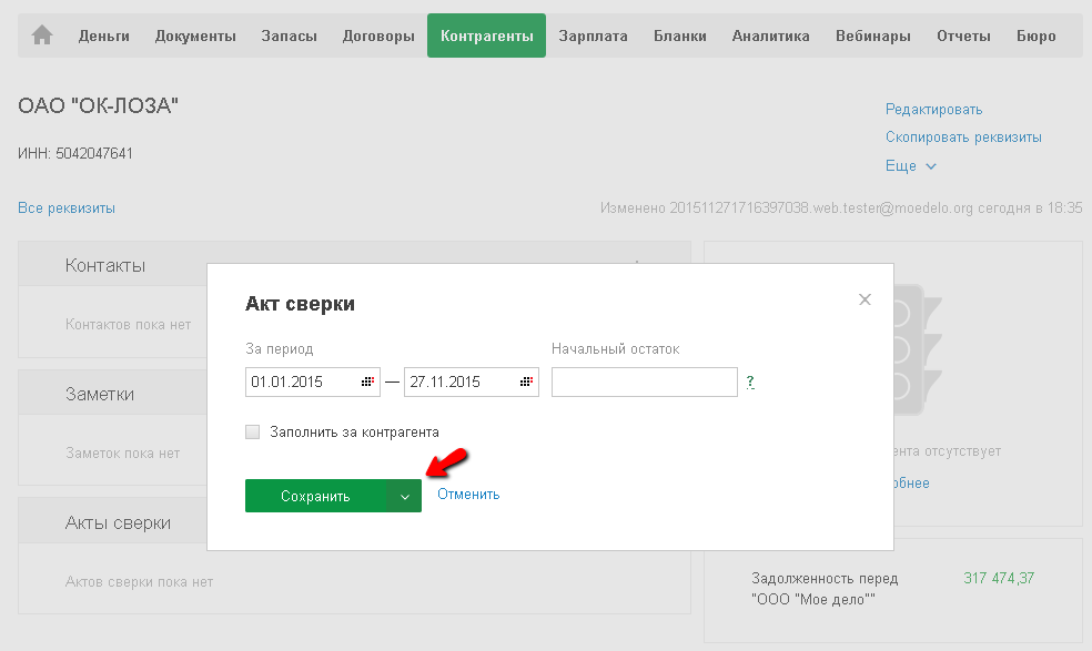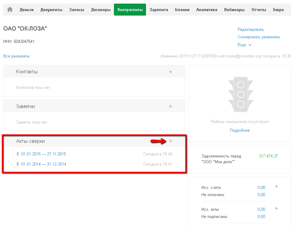 Сохраненные акты сверки посмотреть, скачать, удалить можно в карточке контрагента. Здесь же можно создать новый акт сверки.