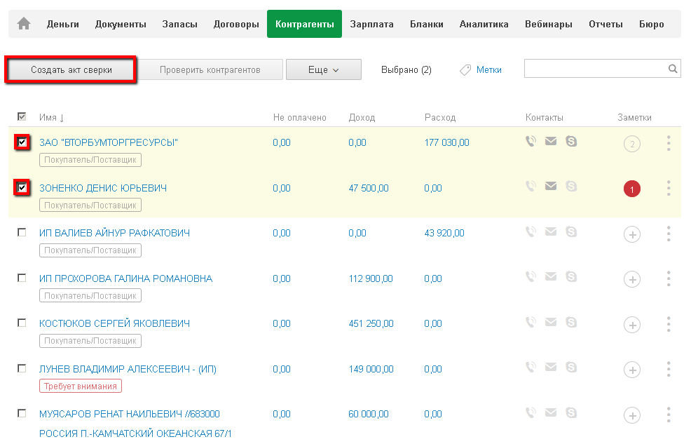 В сервисе реализована возможность групповой отправки актов сверки на e-mail нескольким или сразу всем контрагентам. Для этого в разделе Контрагенты нужно выделить галочками нужных контрагентов и нажать на кнопку "создать акт сверки".