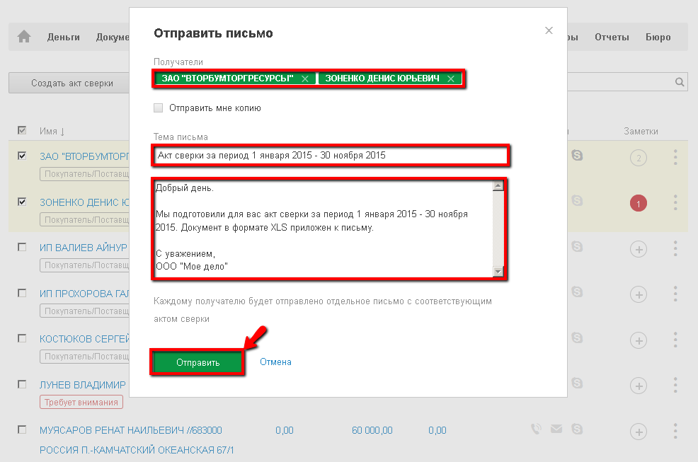 Внимание. В адрес каждого из получателей будет направлено только одно письмо, во вложенном файле которого будет содержаться всего один акт сверки именно с этим контрагентом.