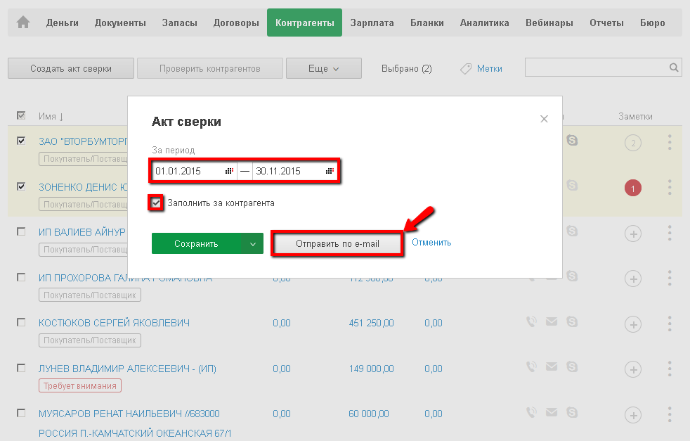 Важно. Чтобы воспользоваться этой возможностью в контактах контрагента должен быть указан адрес электронной почты.