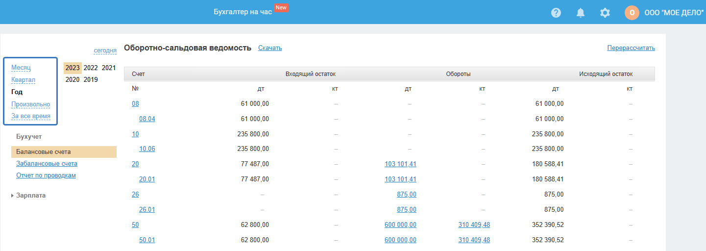 Оборотно-сальдовая ведомость представляет собой таблицу, по каждой строке которой выведены данные о начальных и конечных остатках и об оборотах бухгалтерского счёта за отчётный период. С помощью фильтра вы можете посмотреть ОСВ за определённый период:
