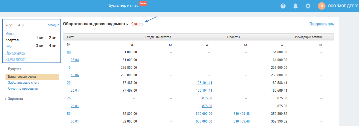 - сформировать и скачать оборотно-сальдовую ведомость (ОСВ);