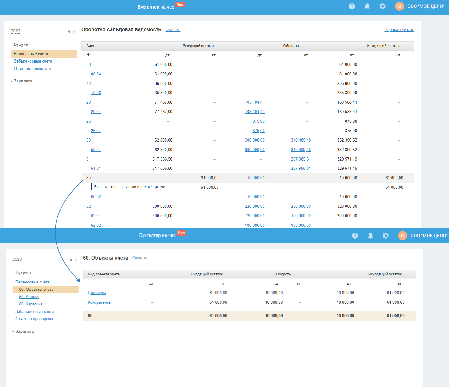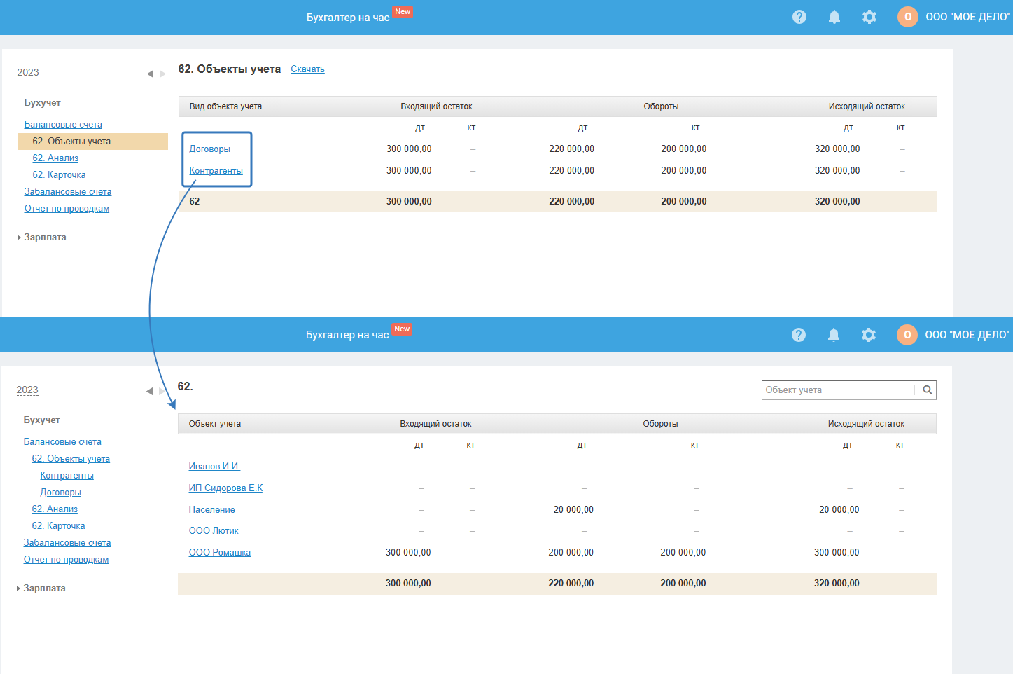 Кликнув по номеру счёта (субсчёта) в ОСВ вы можете увидеть информацию в разрезе объектов учёта (субконто). Например, по 62 счёту — это договоры и контрагенты: