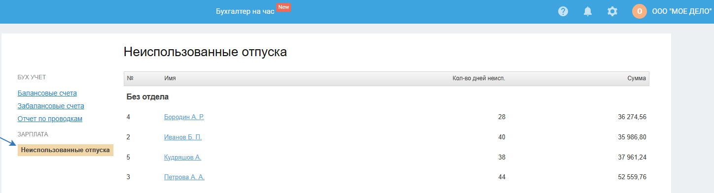 - посмотреть информацию по неиспользованным отпускам у сотрудников.