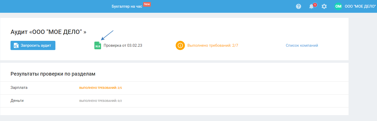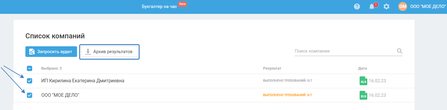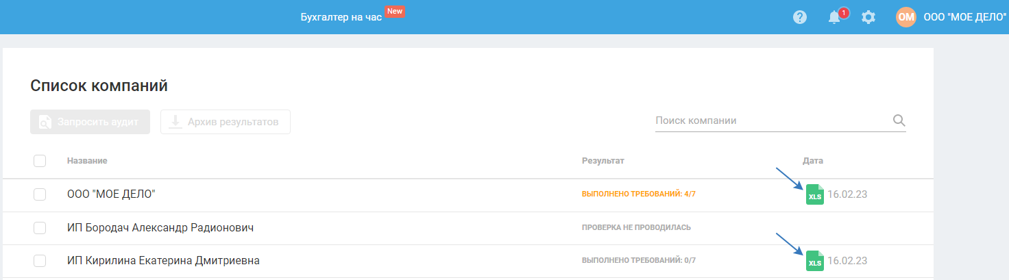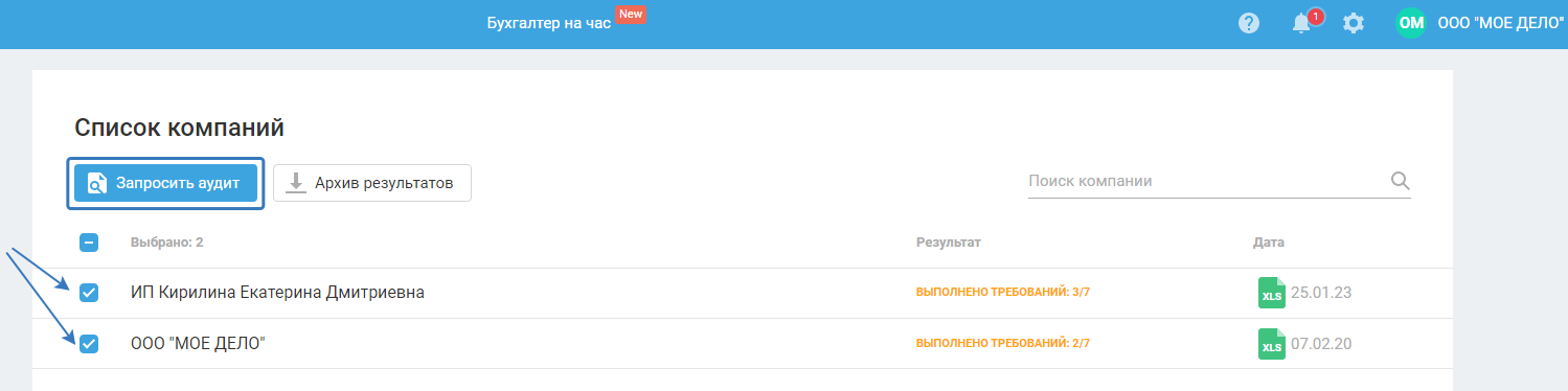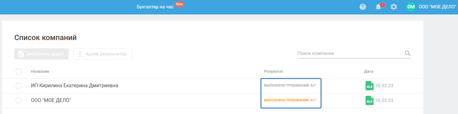 По итогу проверки на экране будет показан результат аудита по выбранным компаниям: