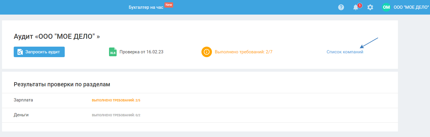 Если к аккаунту привязано несколько компаний, то можно запросить аудит по нескольким компаниям, для этого в разделе «Аудит» нажмите «Список компаний»: