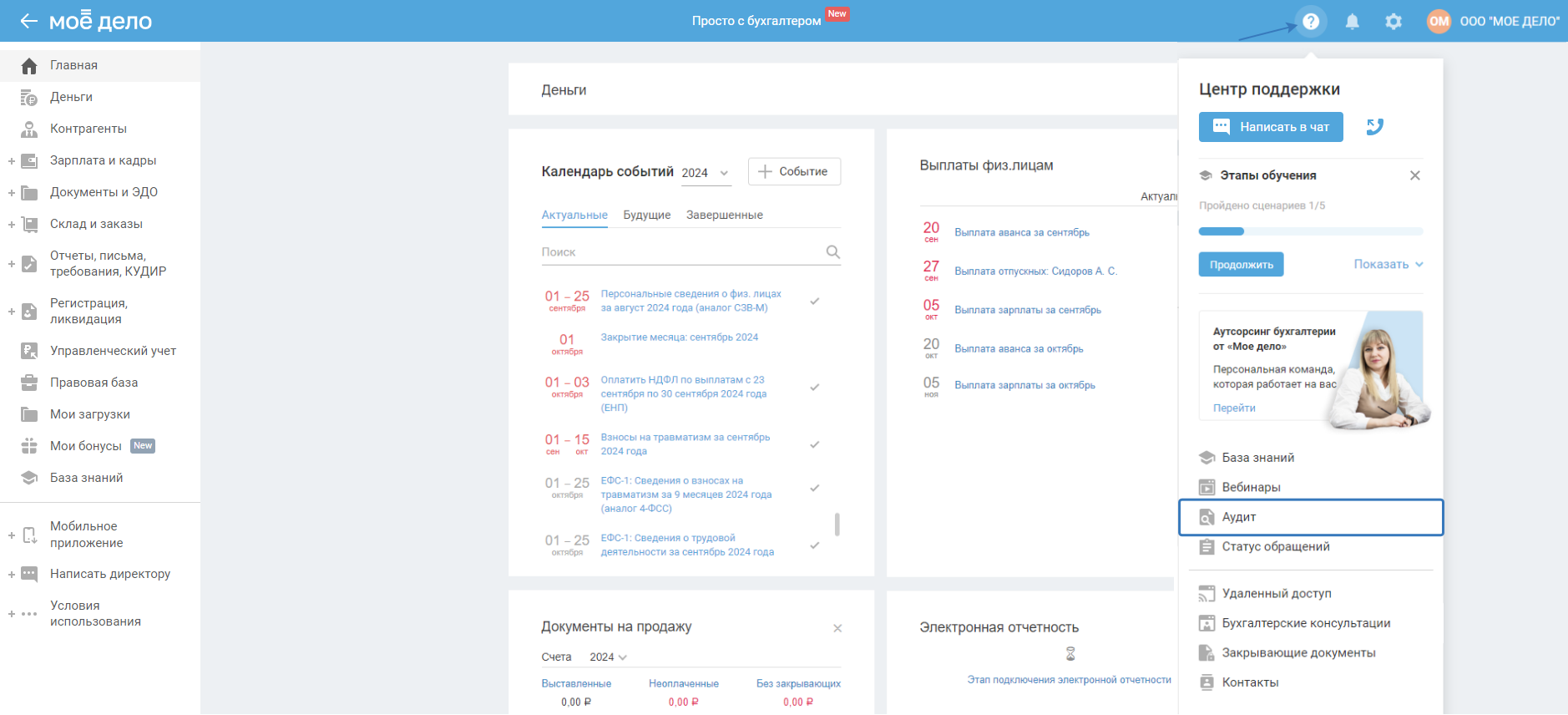 Перейдите в раздел «Центр поддержки» и выберите «Аудит»: