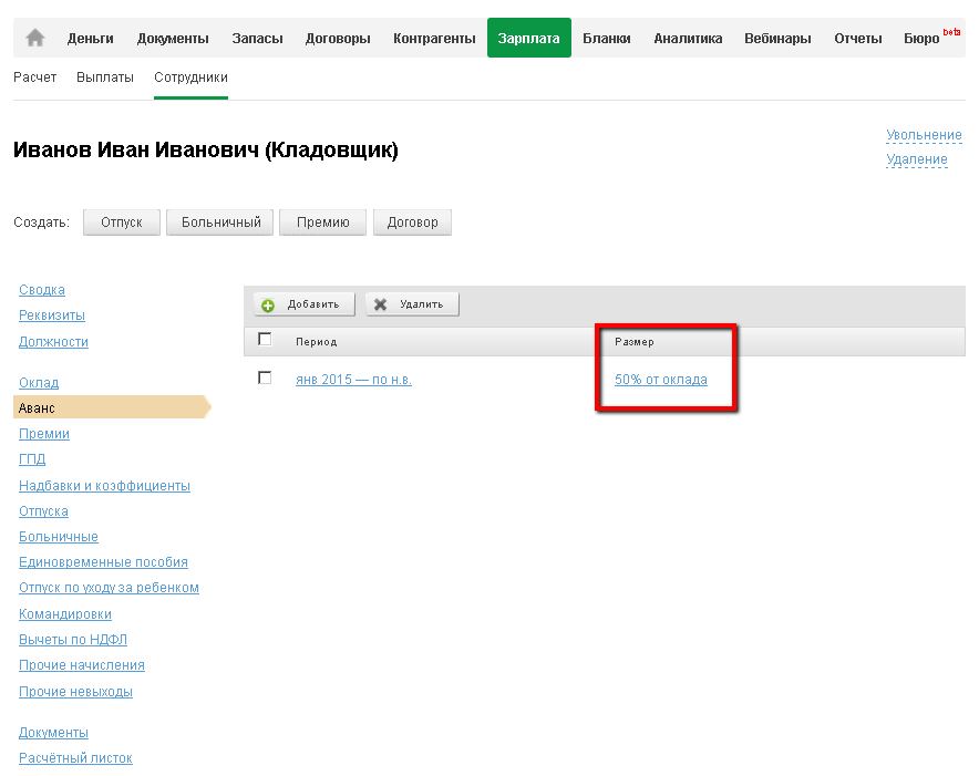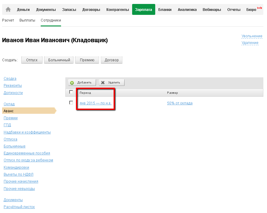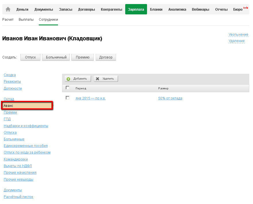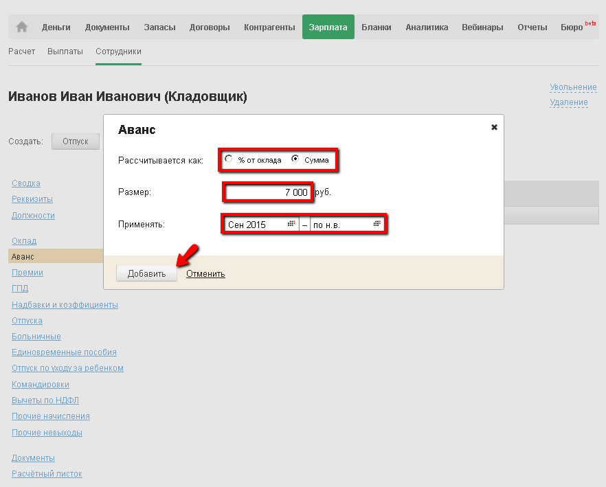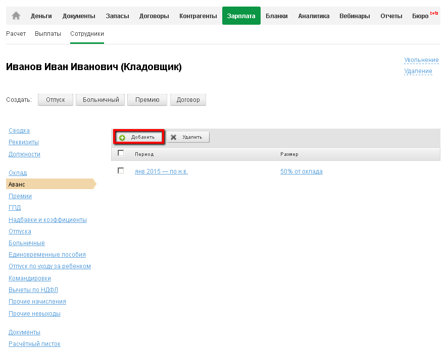 Чтобы добавить новое значение аванса, нужно нажать на кнопку "добавить".