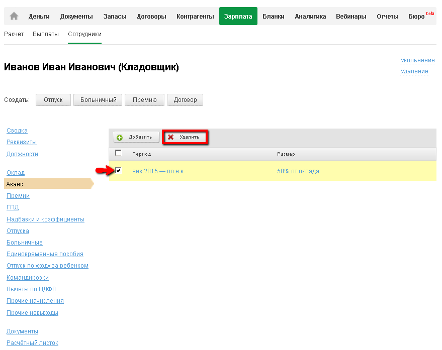 Чтобы удалить информацию о назначенном работнику размере аванса (например, если запись была сделана по ошибке), напротив нее нужно поставить галочку и нажать на кнопку "удалить".