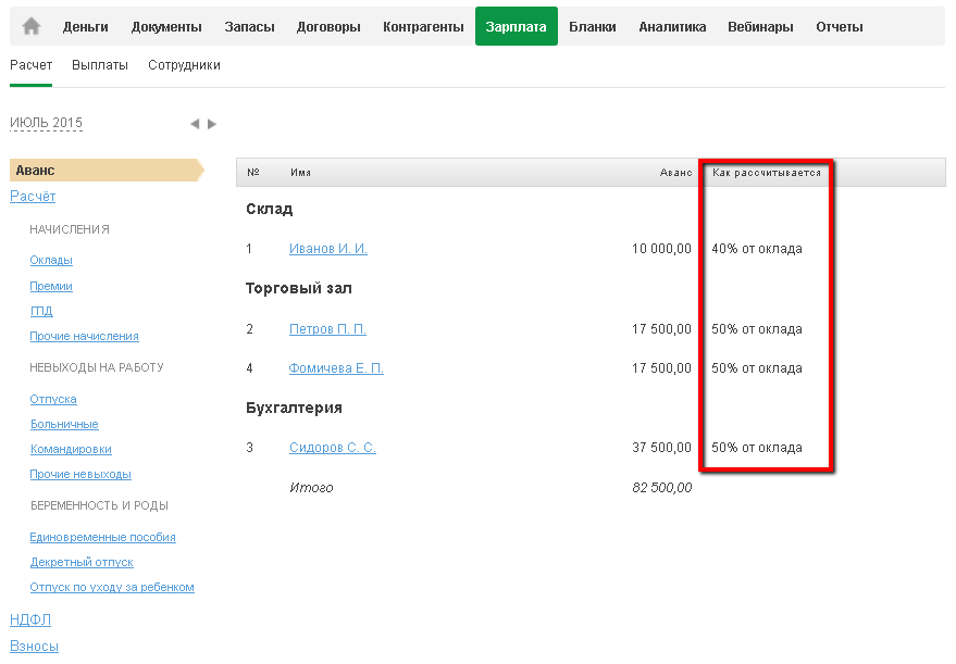 По данной графе можно посмотреть способ расчета аванса, установленный Вами в настройках работников или в настройках выплат.