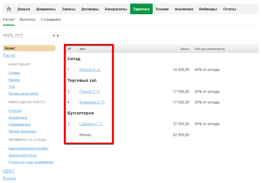 Все данные раздела показываются в разрезе каждого отдельного расчетного месяца, который можно менять вручную в левом верхнем углу данной вкладки. Также информация данного раздела приводится как по каждому отдельному работнику, так и в целом по всем сотрудникам по общей строке "Итого".
