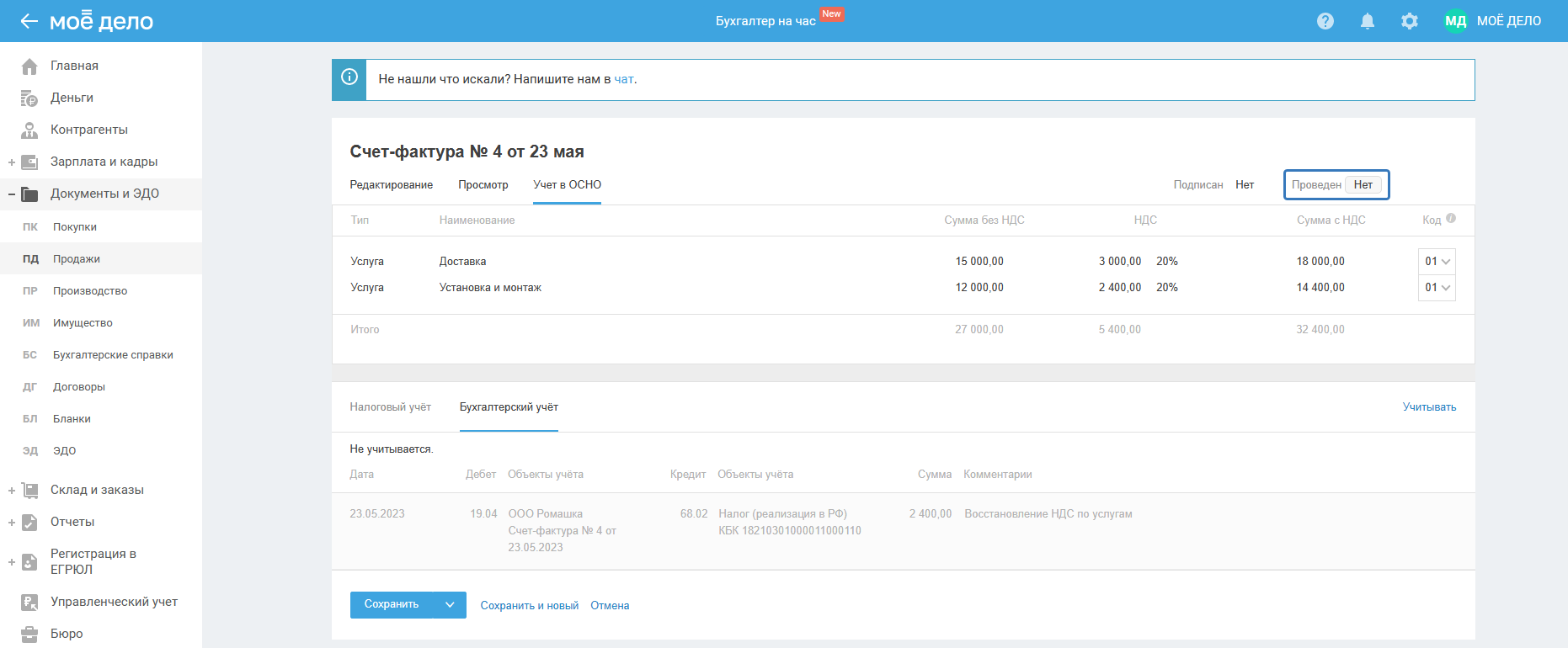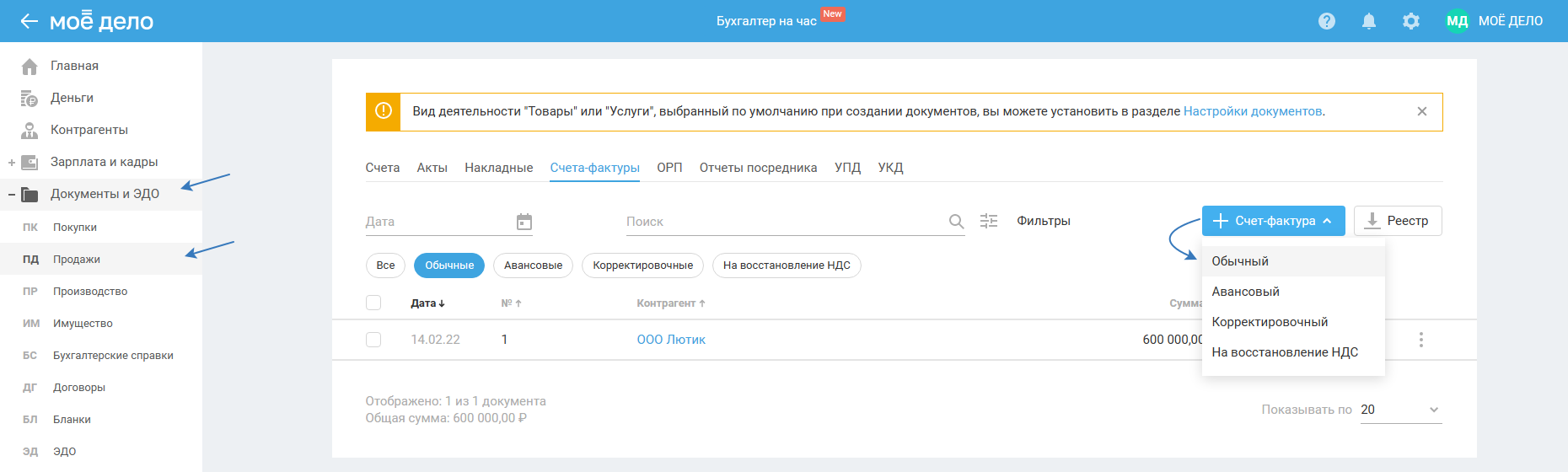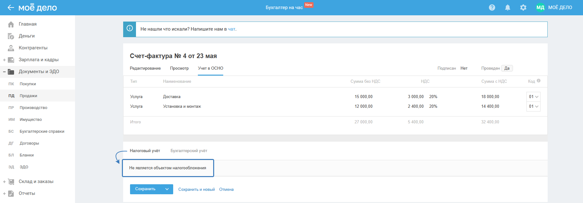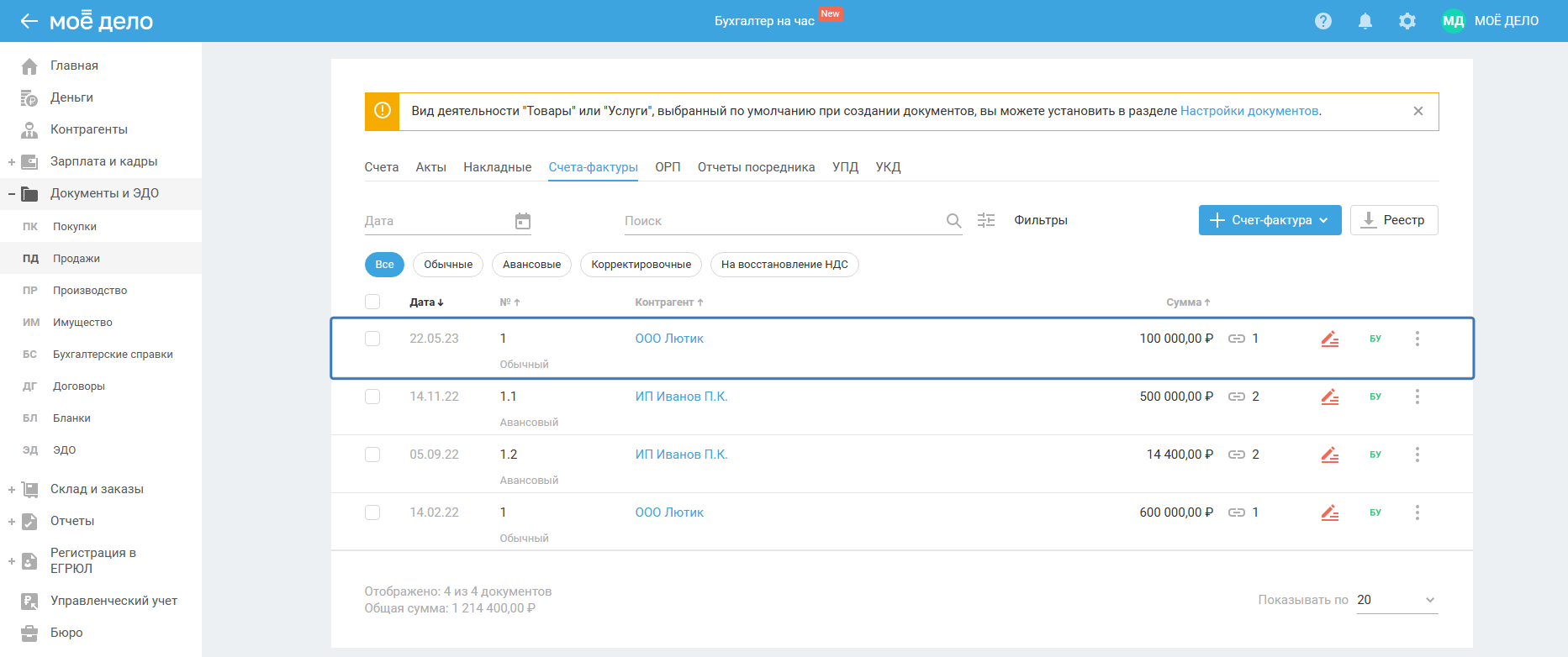 После сохранения акта/накладной счёт-фактура сформируется автоматически в разделе «Документы и ЭДО — Продажи — Счета-фактуры»: