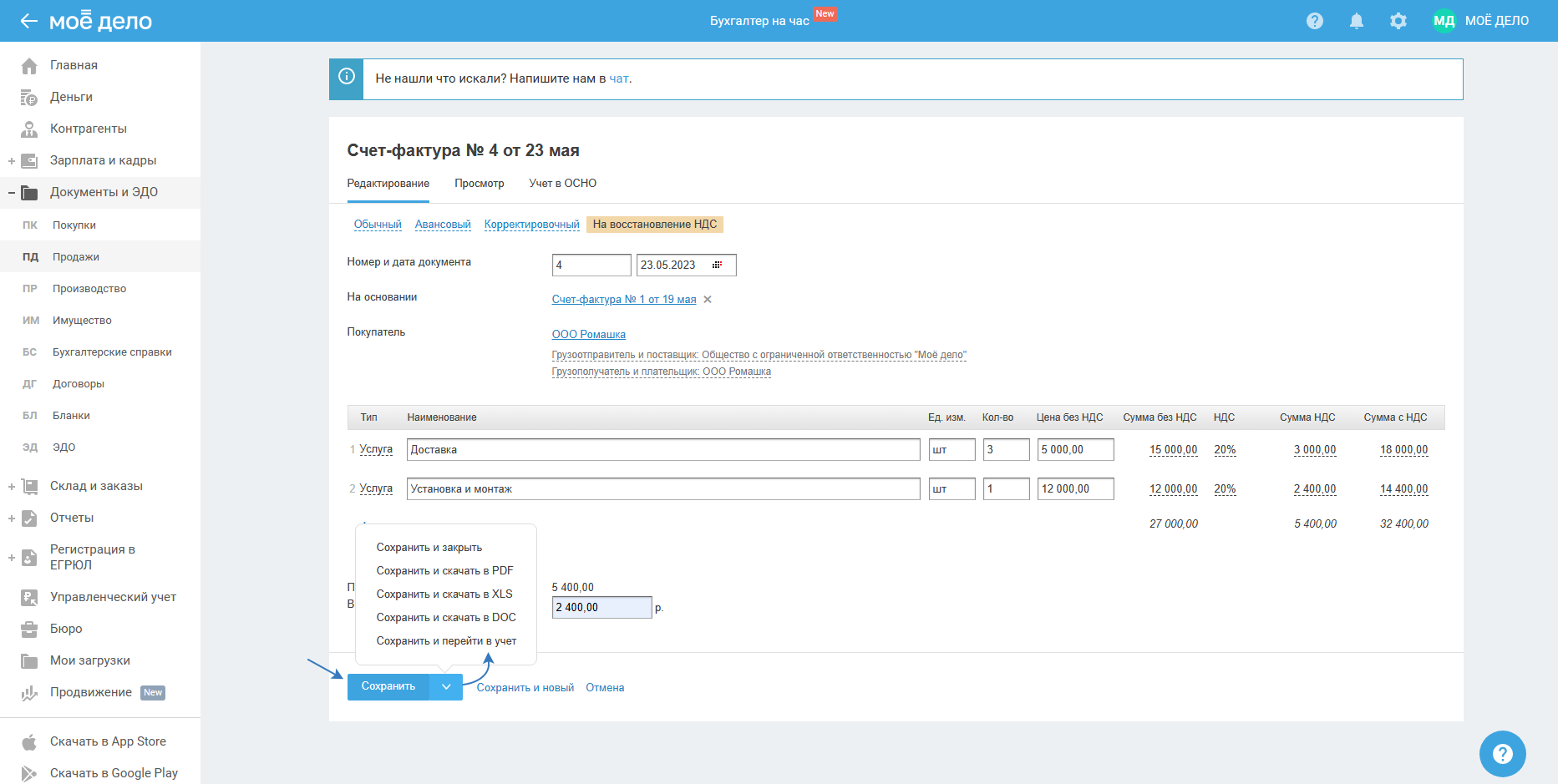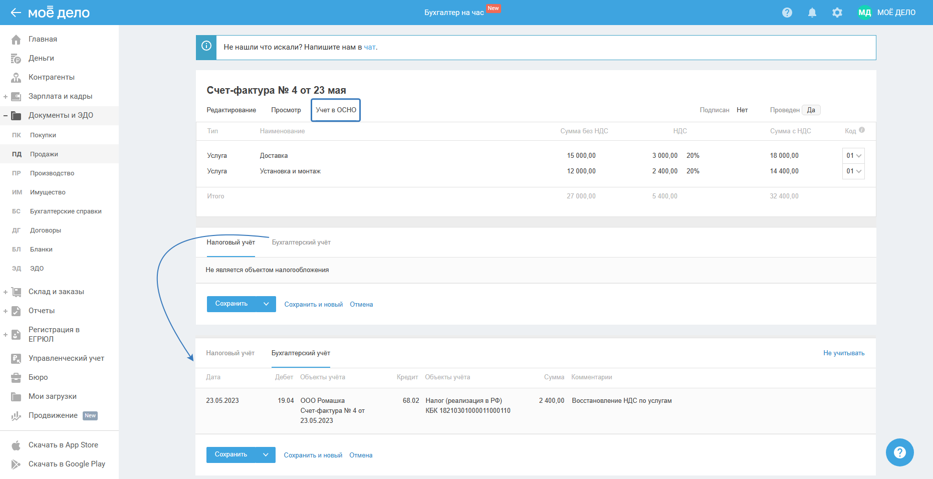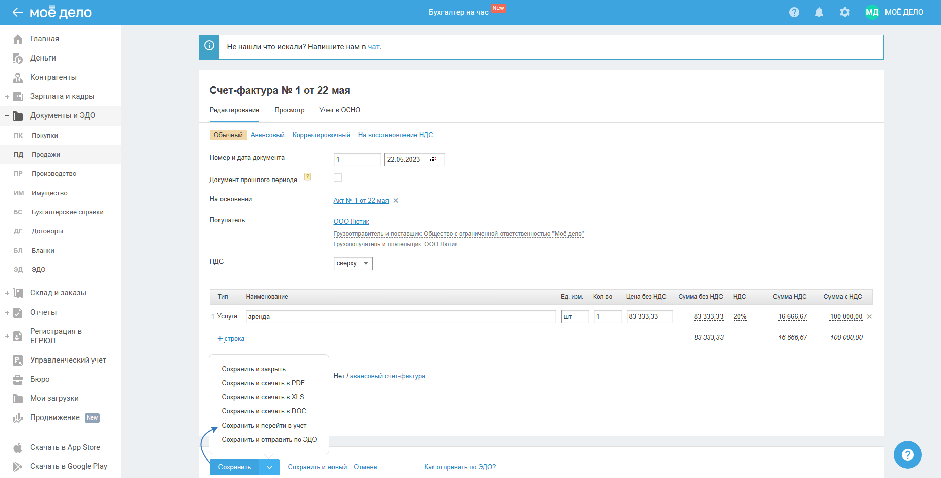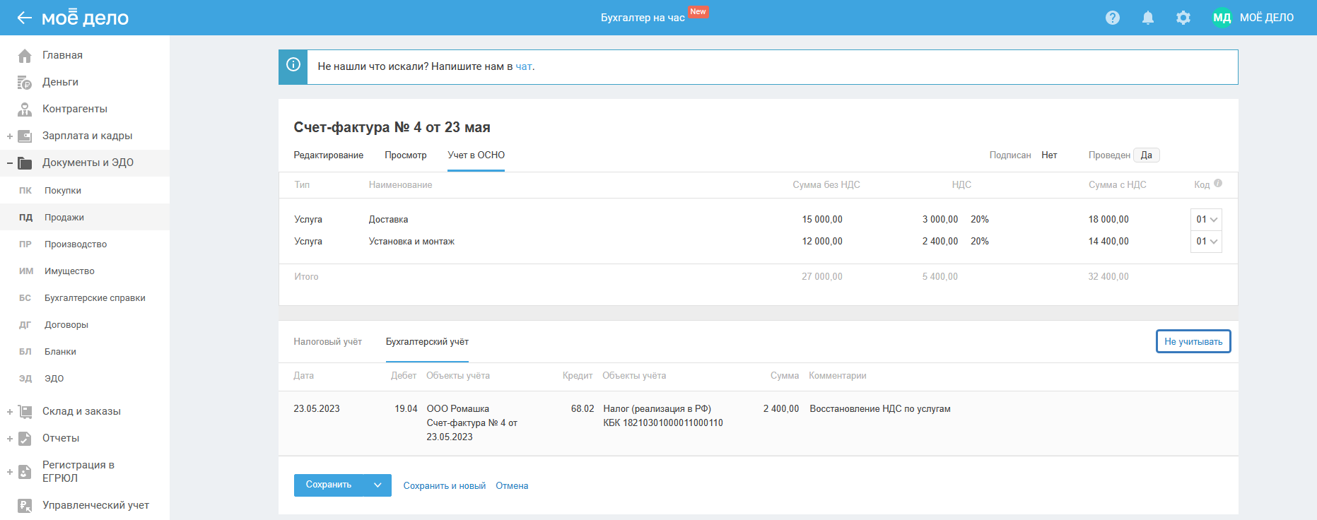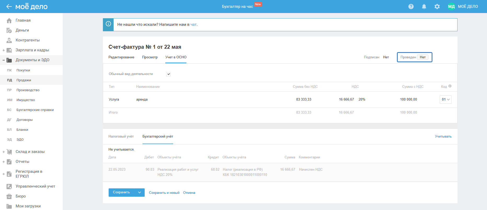 После сохранения акта/накладной счёт-фактура сформируется автоматически в разделе «Документы и ЭДО — Продажи — Счета-фактуры»:
