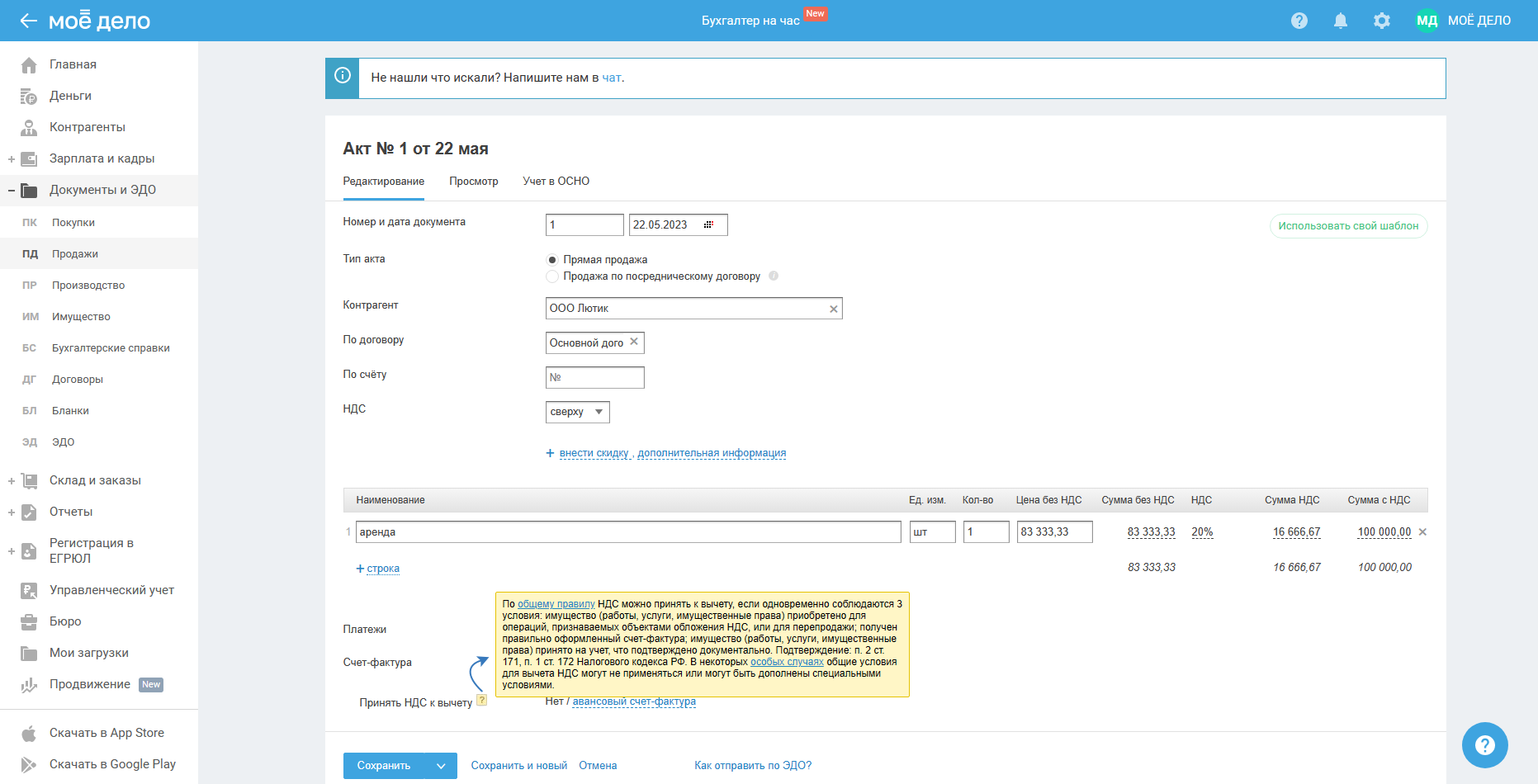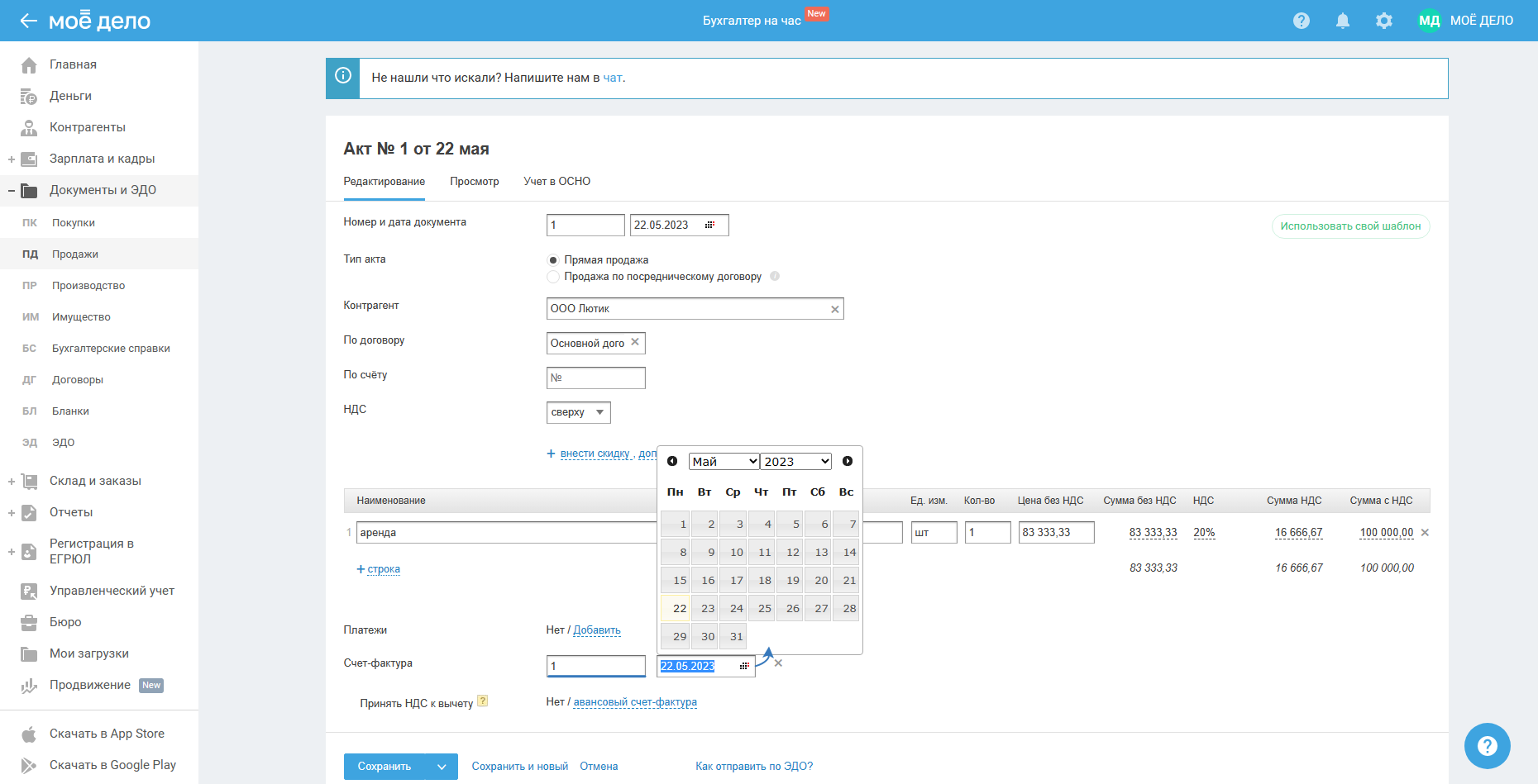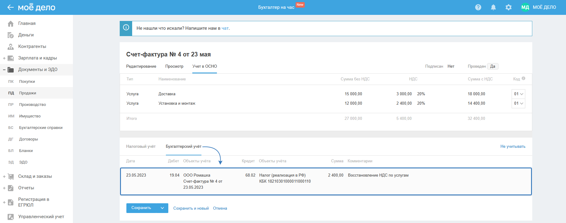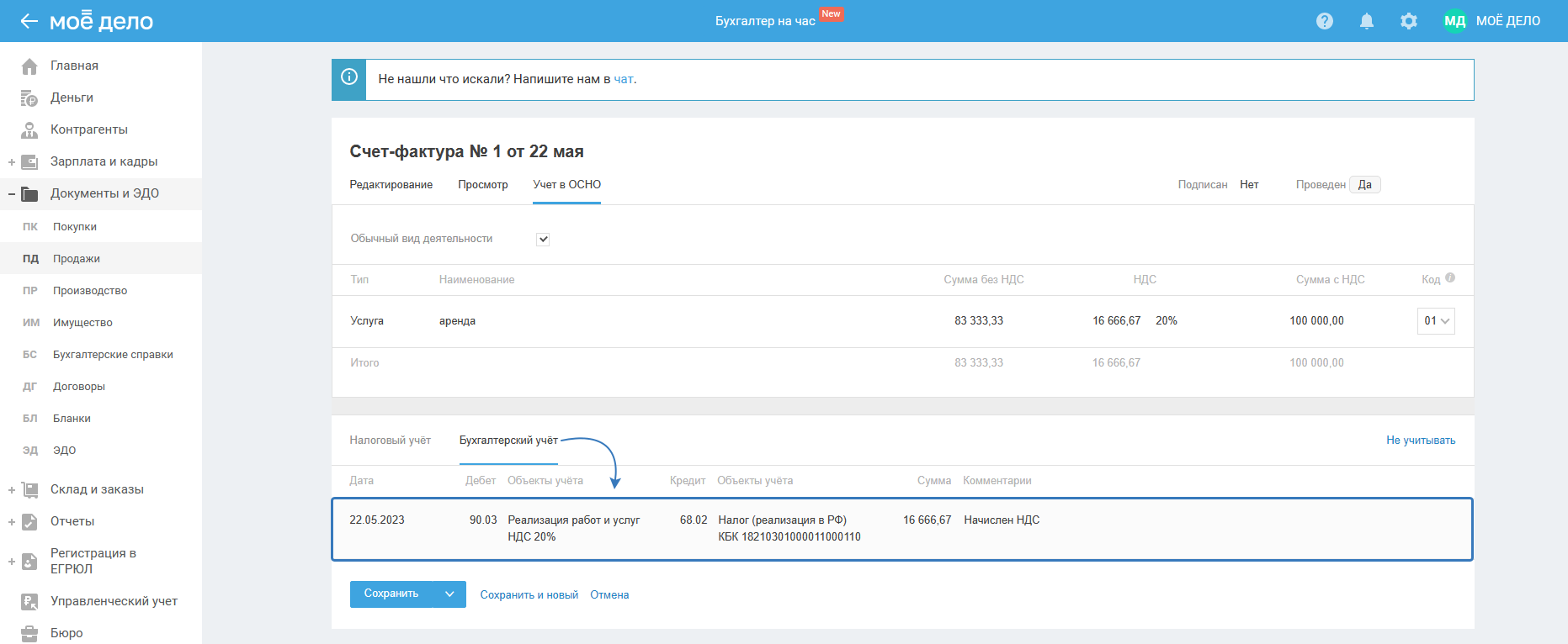 После сохранения акта/накладной счёт-фактура сформируется автоматически в разделе «Документы и ЭДО — Продажи — Счета-фактуры»:
