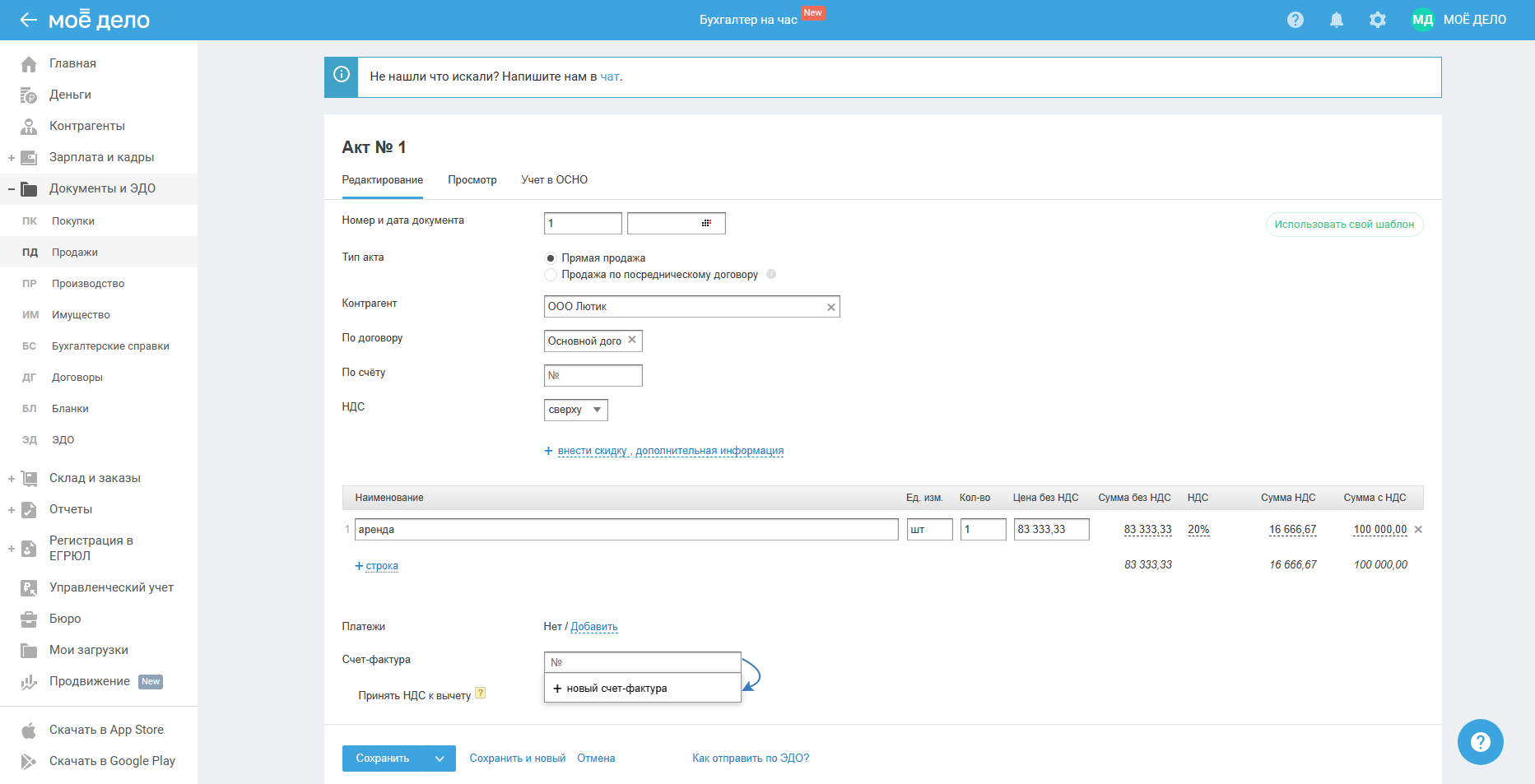 1) Если вы уже создали исходящий акт/накладную, то в поле «Счёт-фактура» выберите «плюс новый счёт-фактура»: