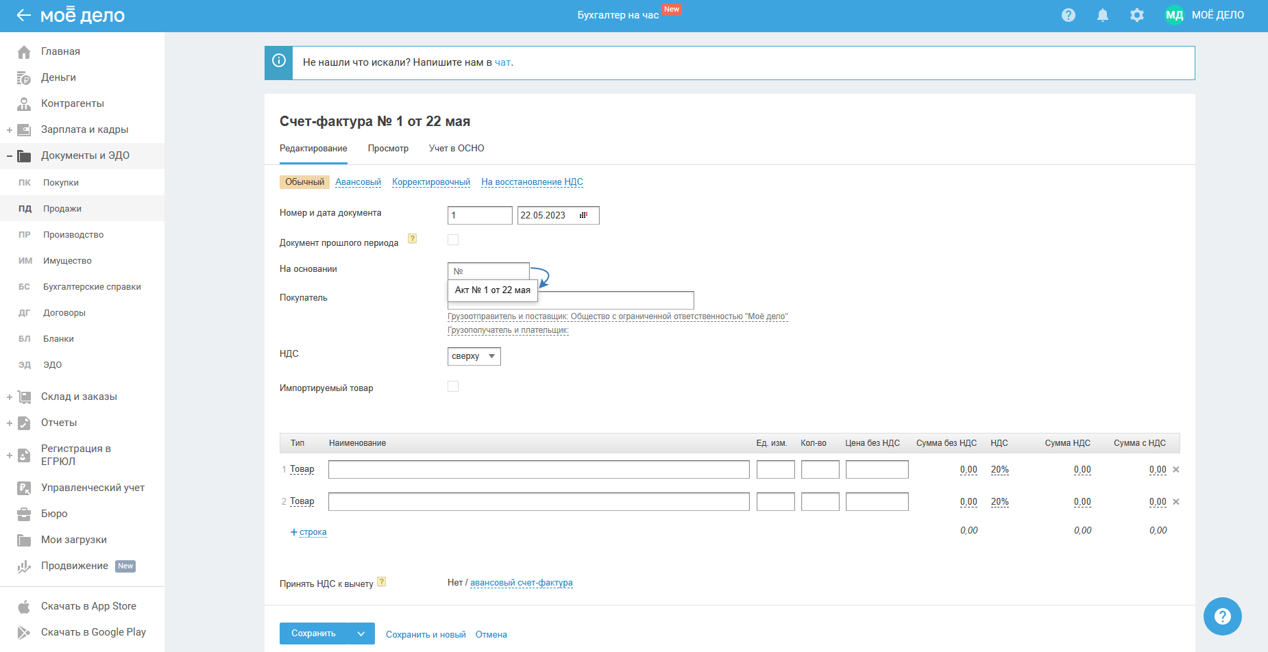 В поле «На основании» выберите из выпадающего списка уже созданный исходящий акт/накладную, и тогда сервис заполнит данные по имеющемуся документу данные в счёте-фактуре: