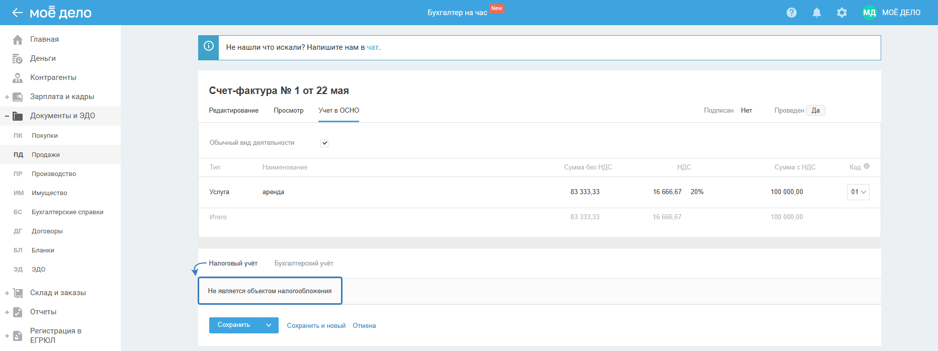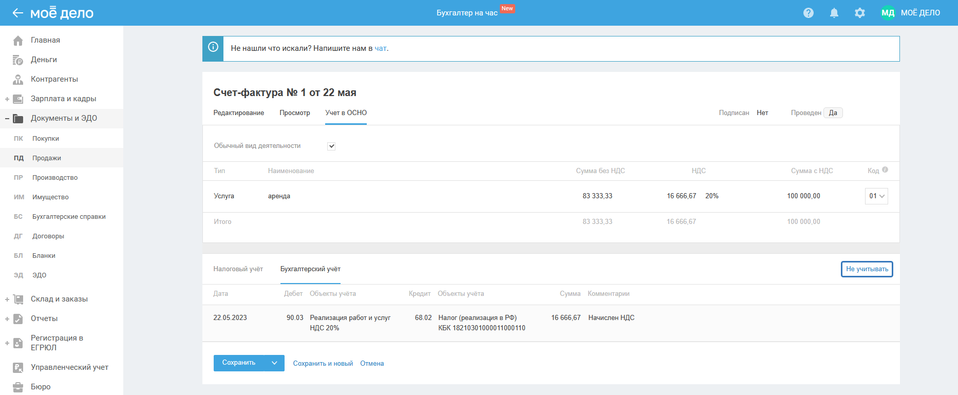 Для того чтобы посмотреть, как созданный счёт-фактура учитывается в налоговом учёте, нажмите на блок «Налоговый учёт»: