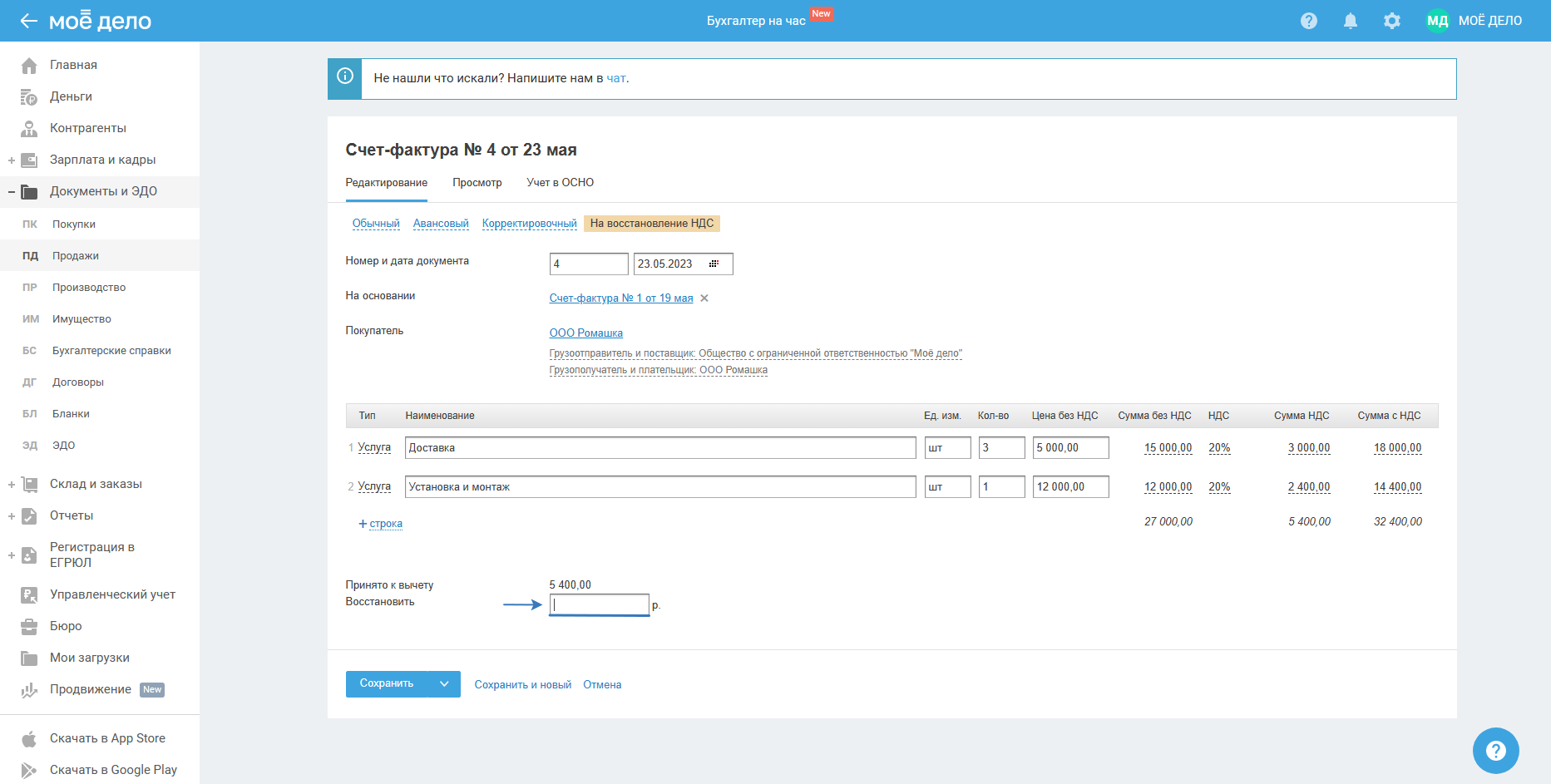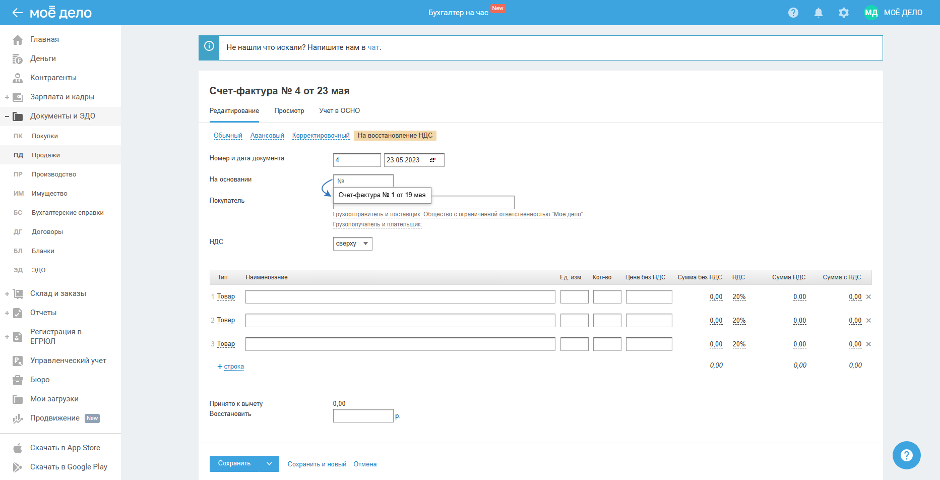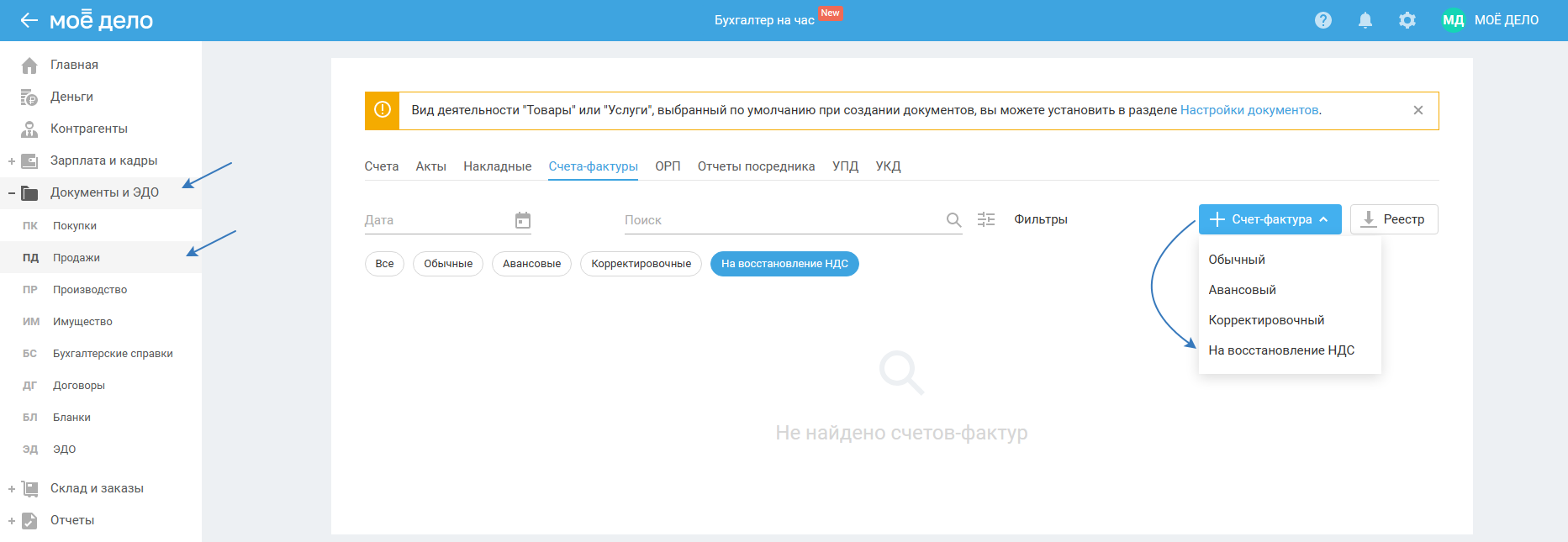 Для создания счёта-фактуры на восстановление НДС пройдите в раздел «Документы и ЭДО — Продажи — вкладка Счета-фактуры», нажмите «+ Счёт-фактура» и выберите «На восстановление НДС»: