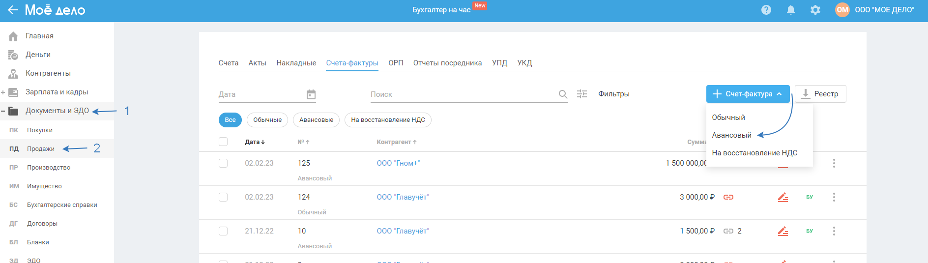 В сервисе счета-фактуры на полученные авансы можно создать либо вручную, либо автоматически из вкладки «Начисление НДС».