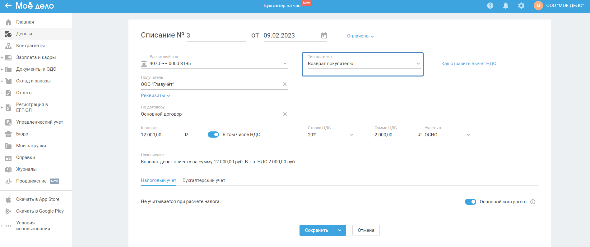 В случае, если «сделка сорвалась» или, к примеру, произошли изменения договора, и вы вынуждены вернуть ранее полученные денежные средства покупателю, то в разделе «Деньги» необходимо отразить это списание, как «Возврат покупателю»:
