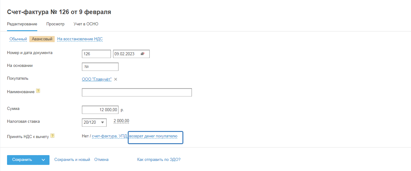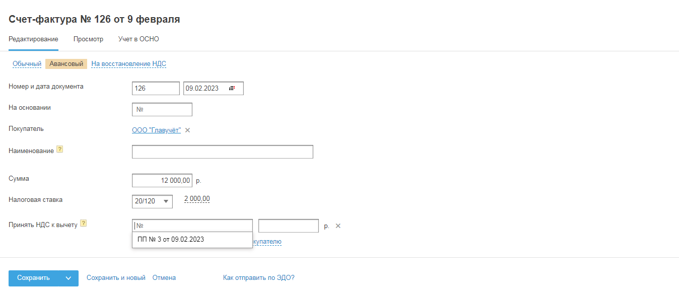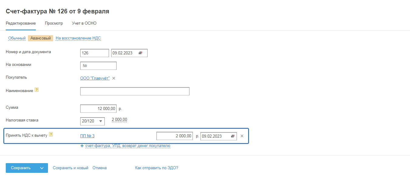 Данную операцию можно отразить как на всю сумму, так и на её часть. Сумма НДС к вычету доступна к редактированию на ваше усмотрение, но она не может превышать сумму НДС по авансовому счёту-фактуре: